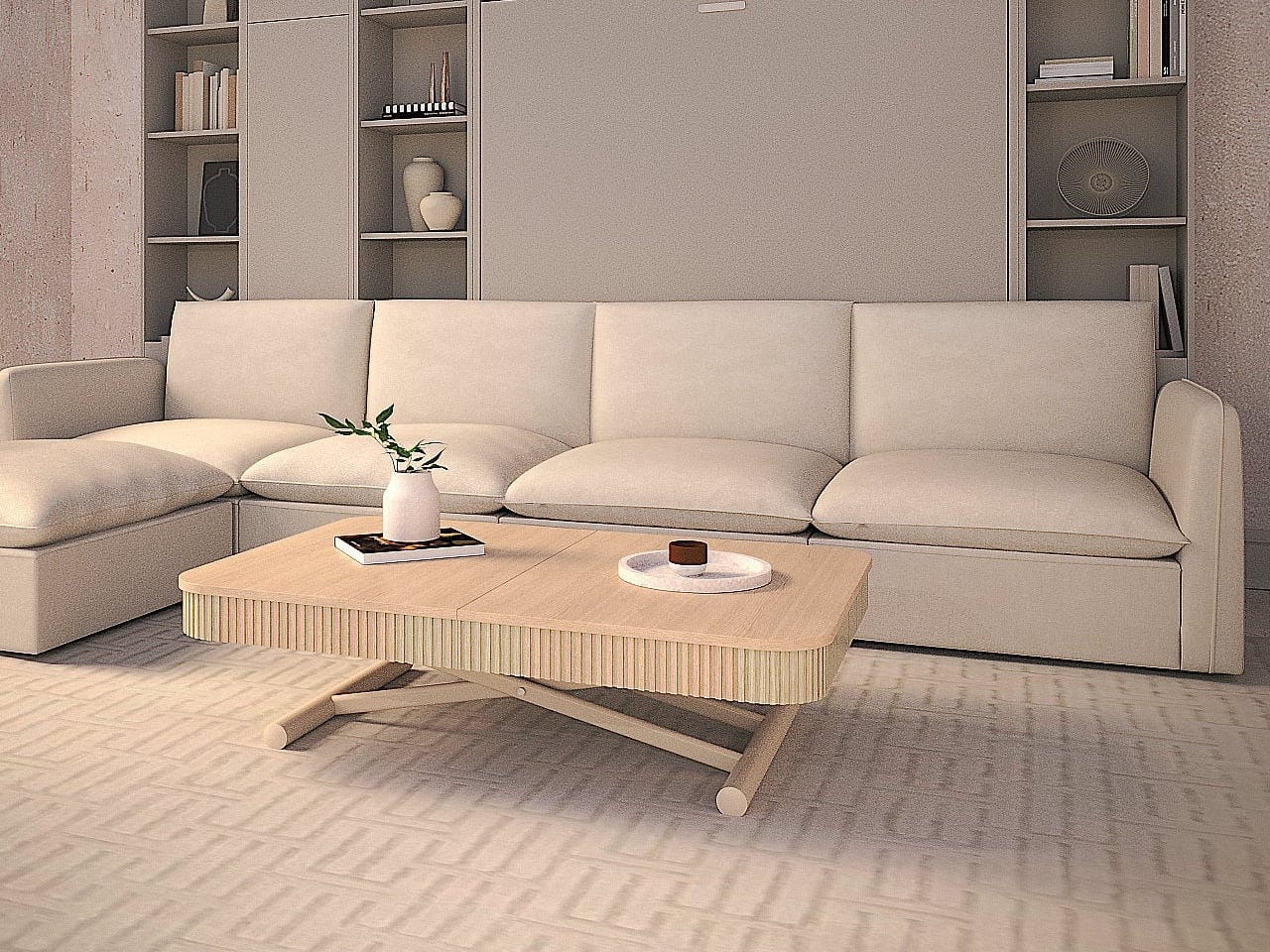 The Box Coffee Curve showcases artistry alongside mechanical ingenuity. Crafted from premium hardwood oak, the curved fluted design features hand-cut, shaped, and polished details created by skilled artisans. This level of craftsmanship elevates the piece beyond purely functional transformation furniture into statement design that radiates sophistication.