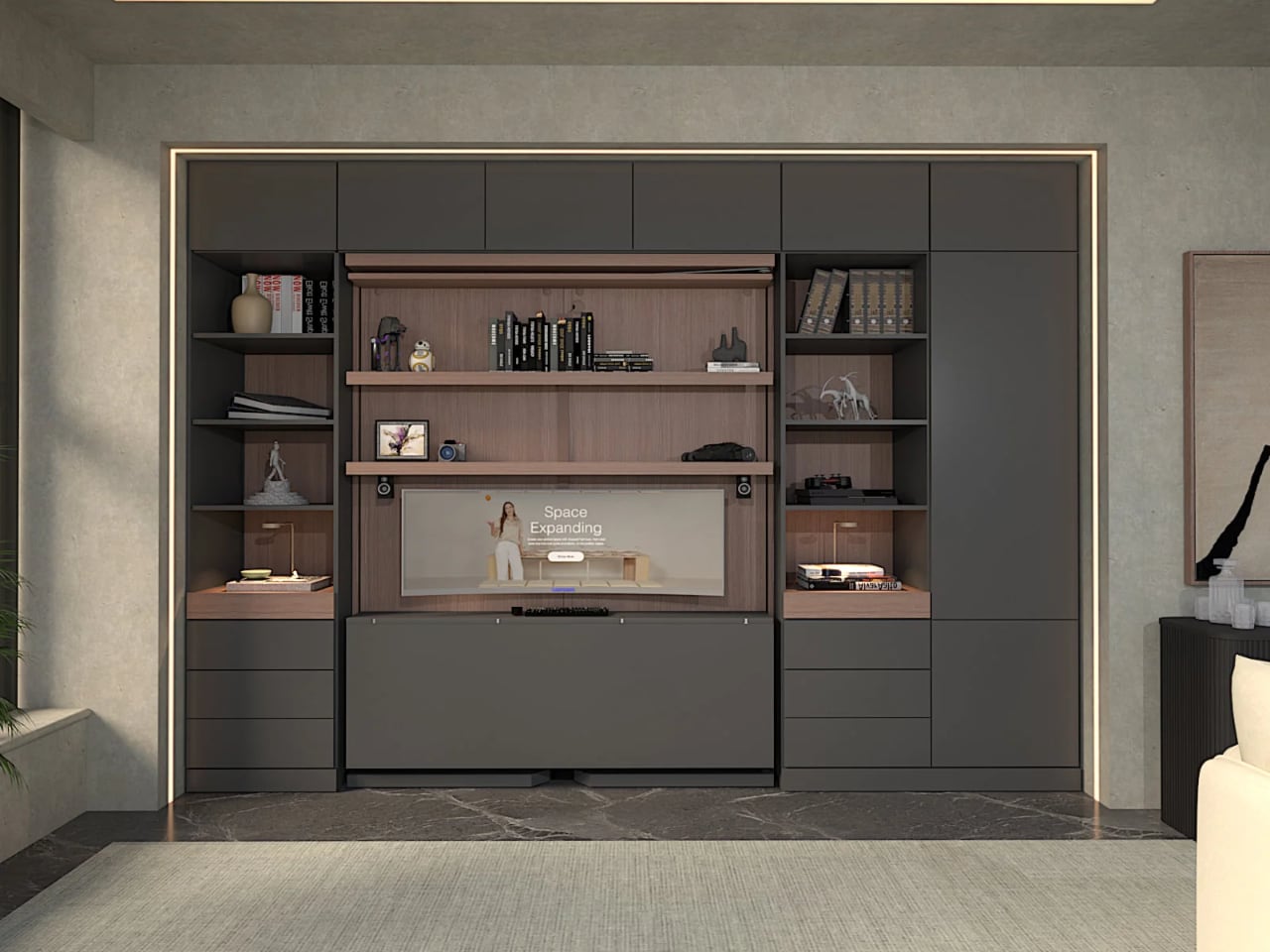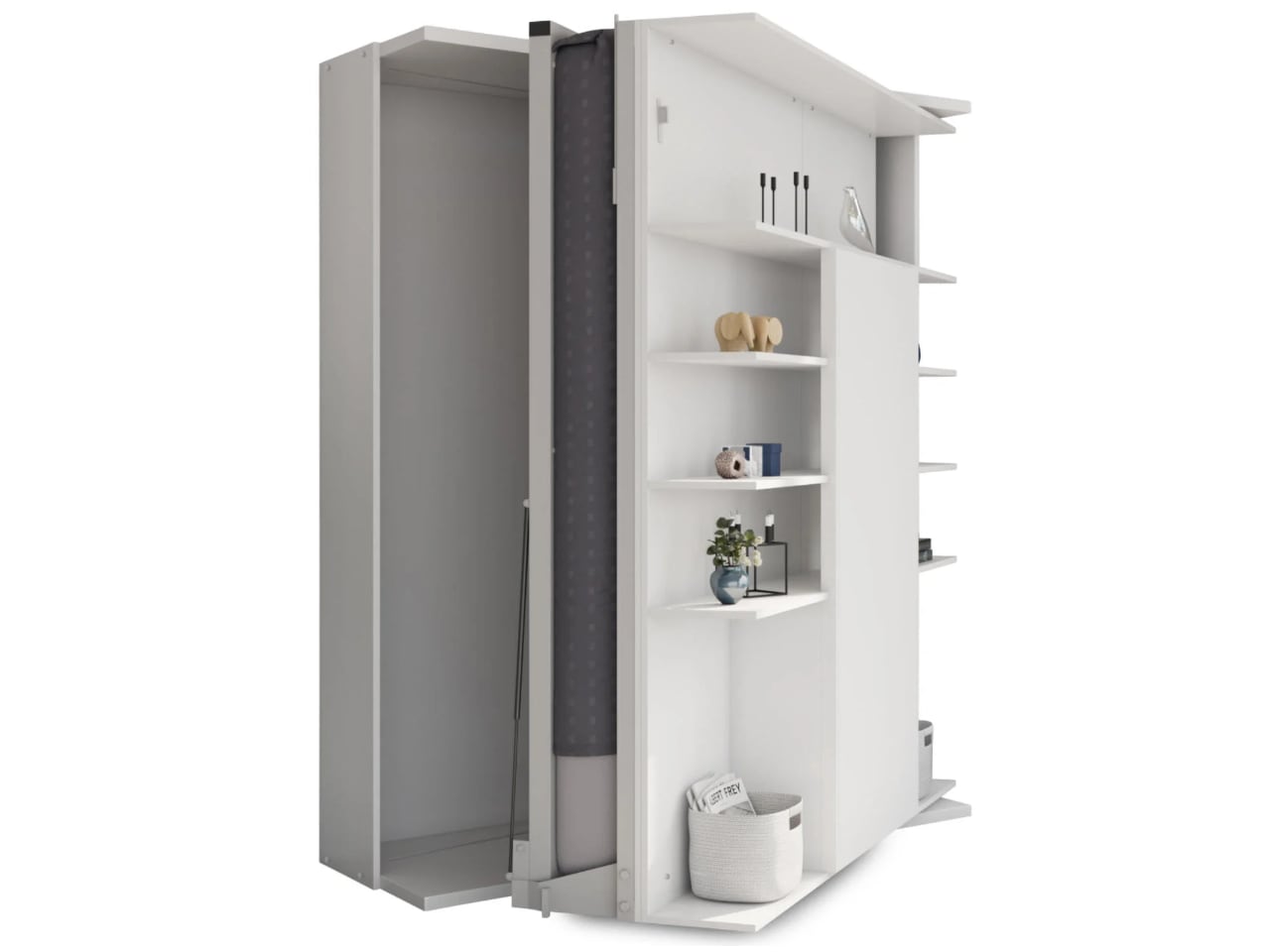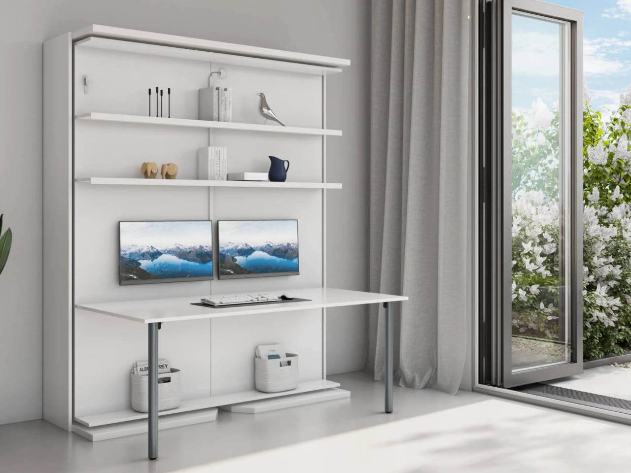 The Compatto represents the most mechanically ambitious piece in Expand’s lineup. This Italian-manufactured system combines a queen Murphy bed with an integrated wide desk supporting dual monitors or a full home office, plus extra shelving for monitors, books, and office supplies. The unit rotates 180 degrees to reveal the bed while books and decorative items remain balanced on shelves throughout the transformation. All mechanics are engineered for smooth, single-person operation.