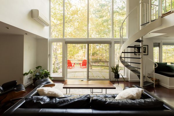 The home was designer by its owner, an abstract expressionist artist. The living area frames forest views with double-height, floor-to-ceiling windows.