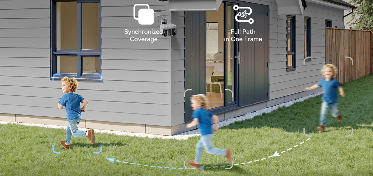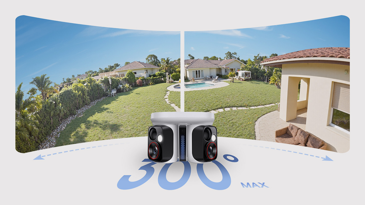 The panoramic coverage reaches up to 300 degrees through the combined efforts of both cameras, each offering 125 degrees of field of view plus 55 degrees of motorized pan. The split-screen viewing mode lets you see both camera feeds at once, while the seamless handoff between cameras ensures uninterrupted tracking when subjects move from one zone to another.