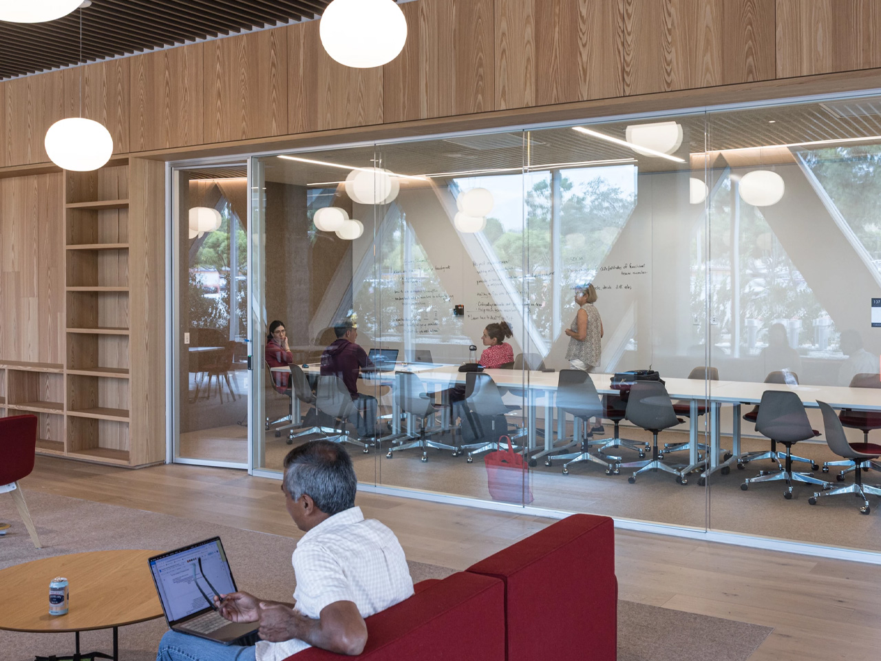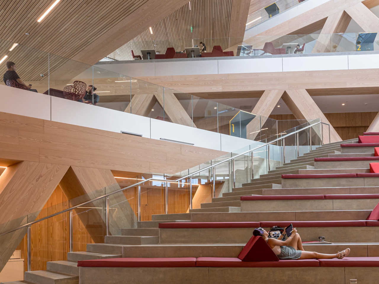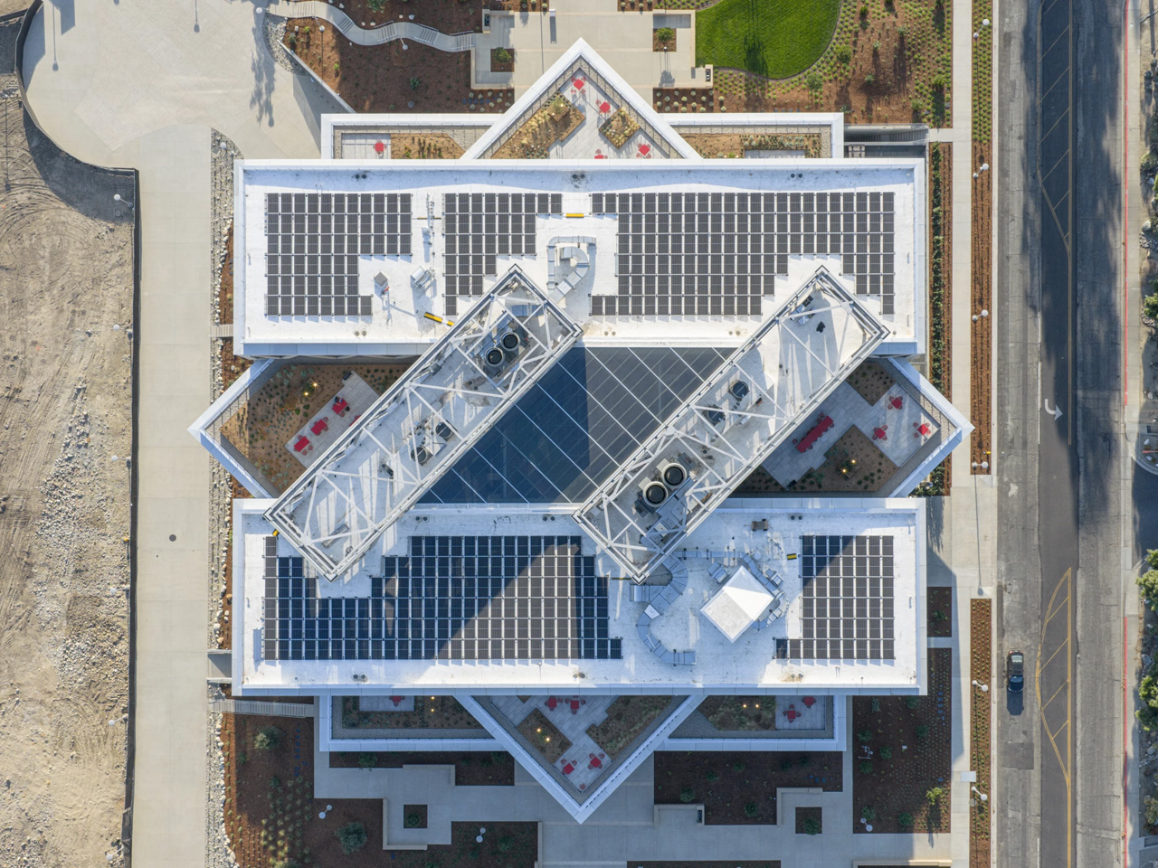 The design responds directly to its Southern California setting. Those rotating volumes aren’t just sculptural—they create shaded outdoor spaces essential for the region’s climate. Each rotation generates terraces and balconies that encourage students to step outside between lab sessions. The concrete construction provides thermal mass that helps regulate interior temperatures naturally. BIG positioned the building to maximize natural light while minimizing heat gain, a balance that matters when you’re housing sensitive research equipment.