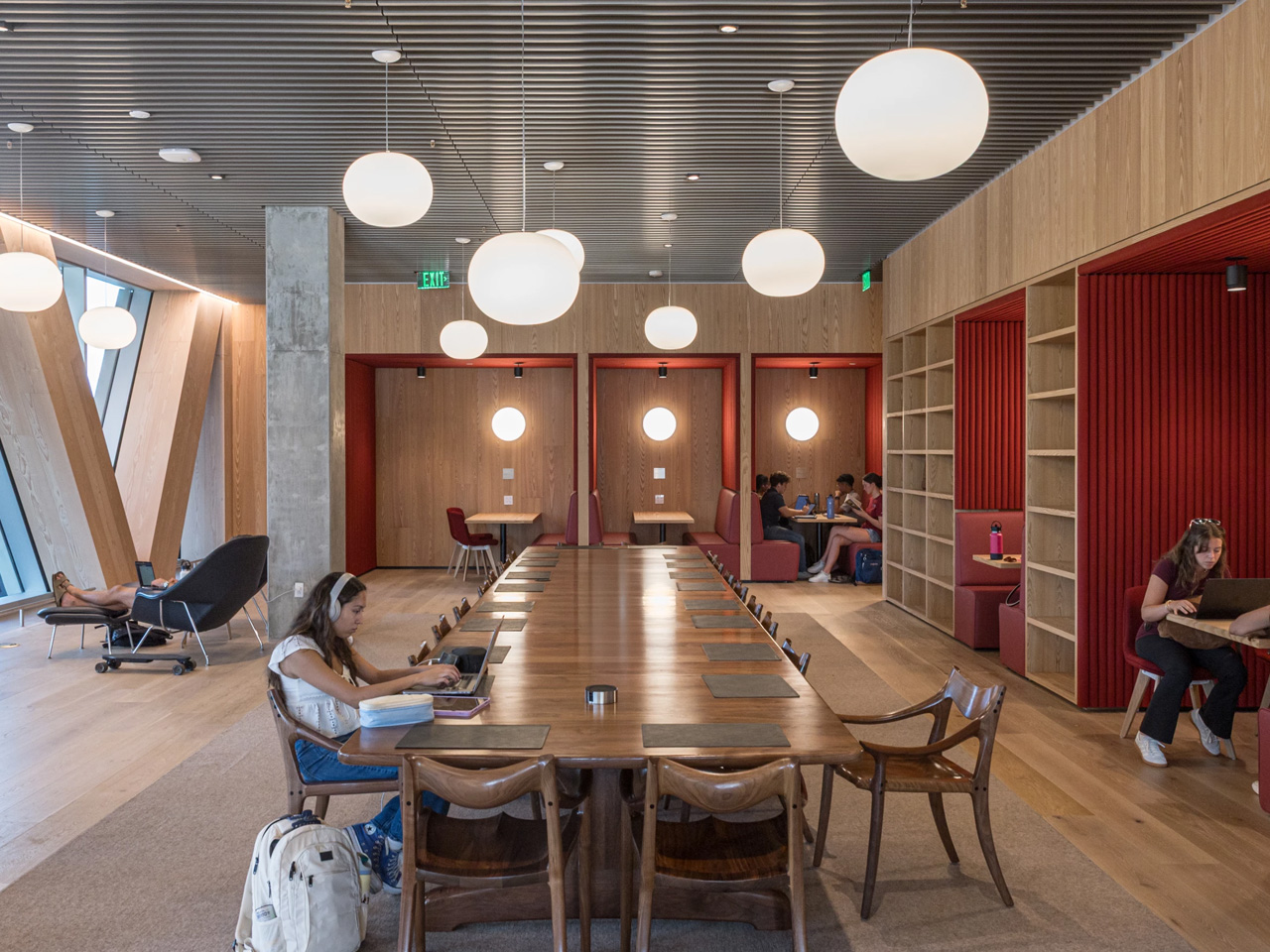 The center brings together multiple scientific disciplines under one roof. Students studying genealogical research, climate science, and neuroscience share labs and collaboration spaces across the building’s multiple floors. This interdisciplinary approach shaped the entire layout. Open research areas sit alongside flexible teaching spaces, allowing faculty to adapt rooms as research needs evolve. The building accommodates 1,400 students, creating a critical mass of scientific inquiry that the college previously lacked in a single dedicated facility.