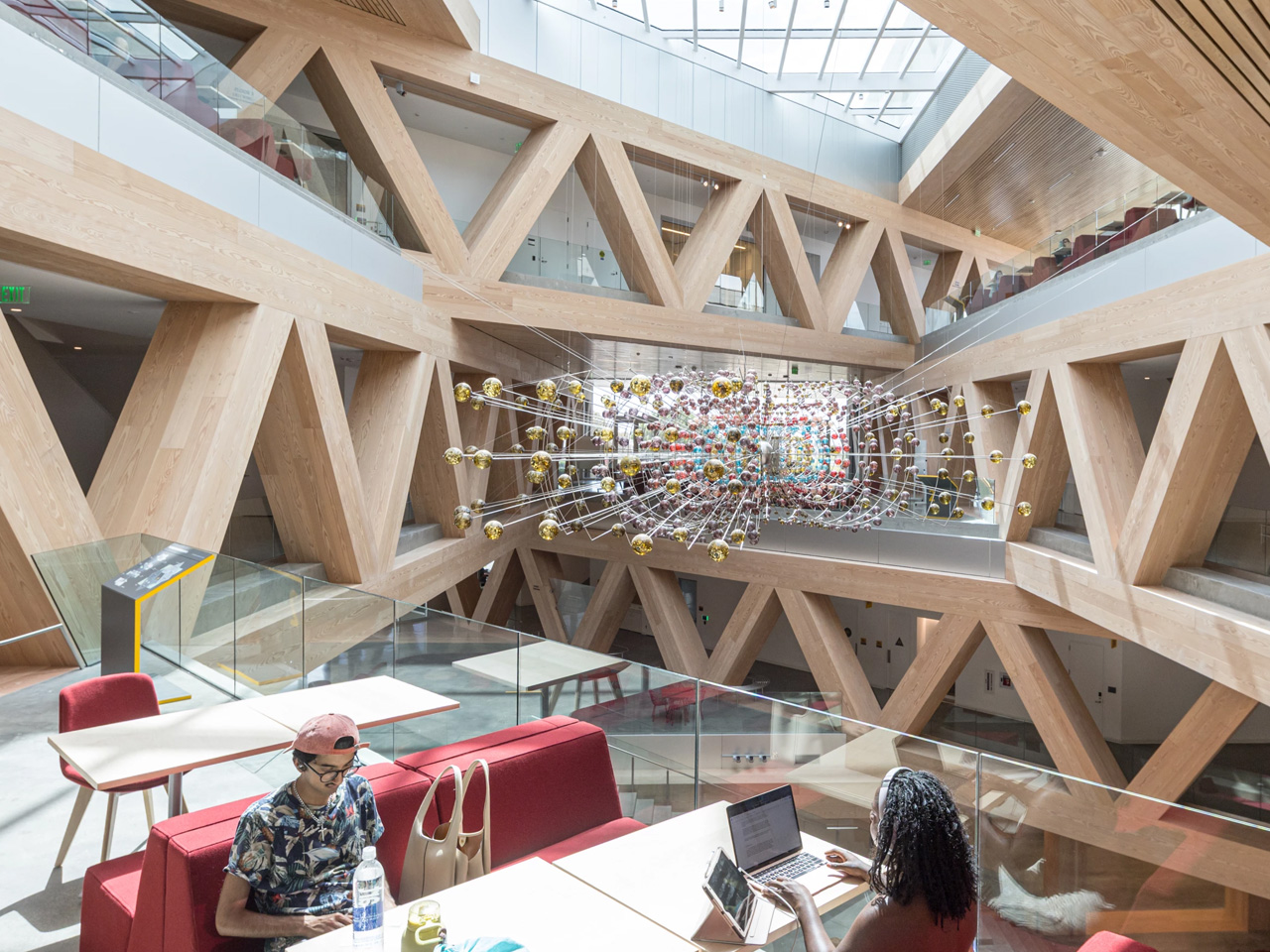 A 30-foot sculpture suspended in the building’s central atrium captures the intersection of art and scientific inquiry. The installation visualizes Earth’s magnetosphere through 18 metal rings and 1,476 hand-blown glass spheres. It’s not decorative—the piece translates complex scientific data into physical form, helping students grasp abstract concepts through spatial experience. The sculpture changes appearance as you move through the building, offering different perspectives from each floor.
