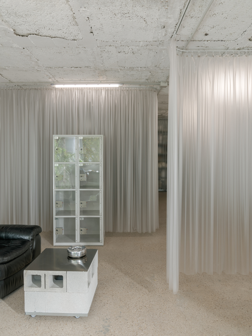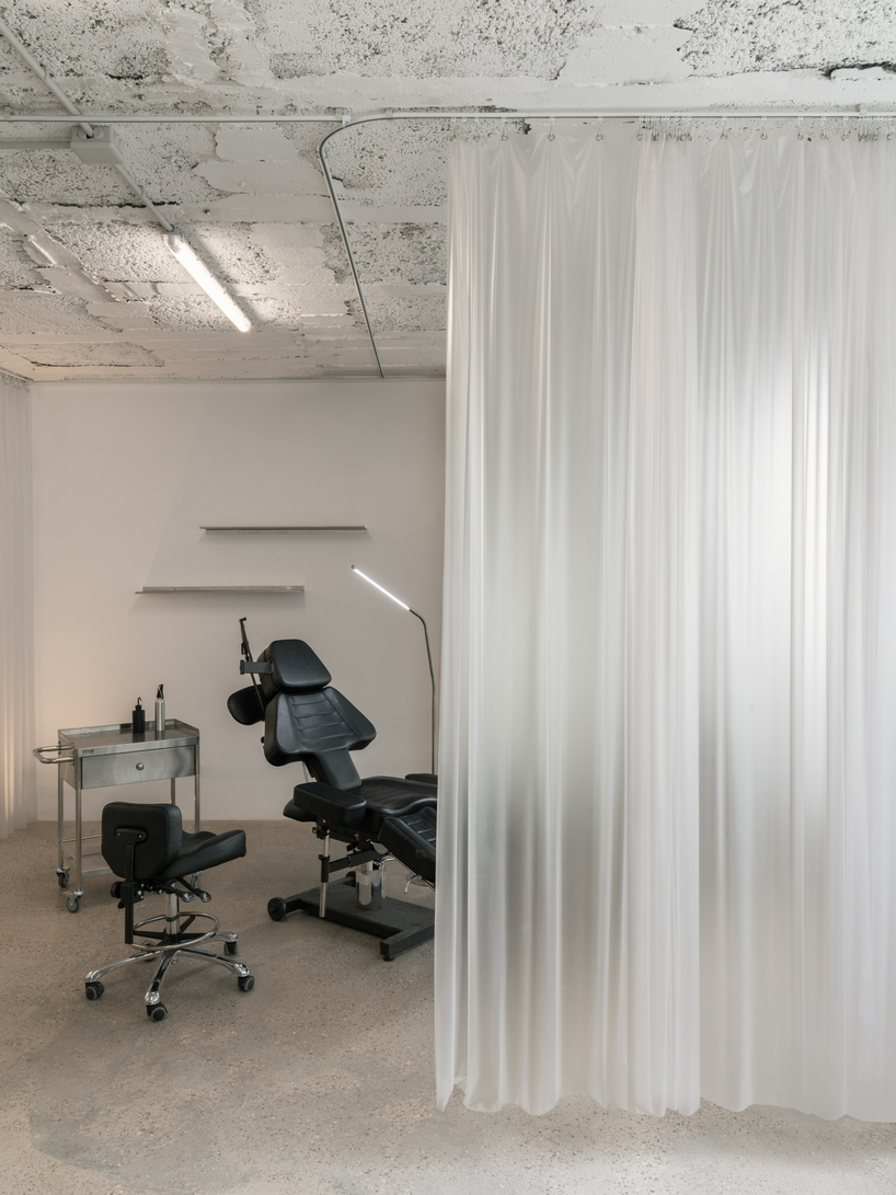 The 80-sqm warehouse conversion employs polished concrete, locally sourced stainless steel, and handcrafted PVC curtains to define a flexible interior that shifts between transparency and opacity. The existing ceiling structure was exposed to reveal its original framework, while linear LED fixtures accentuate the geometry of the space and introduce a controlled, uniform illumination. The studio accommodates up to four artists simultaneously within a modular plan that supports multiple configurations. Mobile partitions and adjustable lighting systems enable the workspace to adapt to various functions, from tattooing to exhibition and consultation.