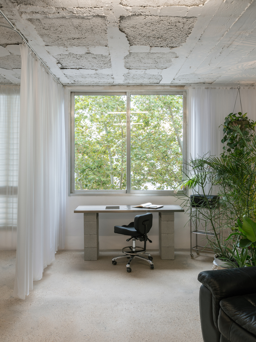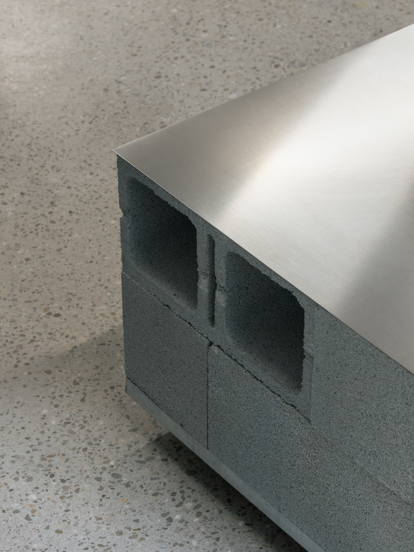 low table made of concrete blocks and a steel top expresses the studio’s raw and modular character