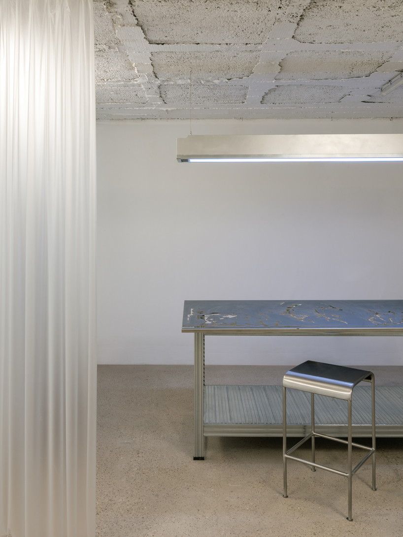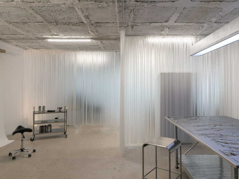 custom-made metal tables reflect both the technical and creative layers of the studio