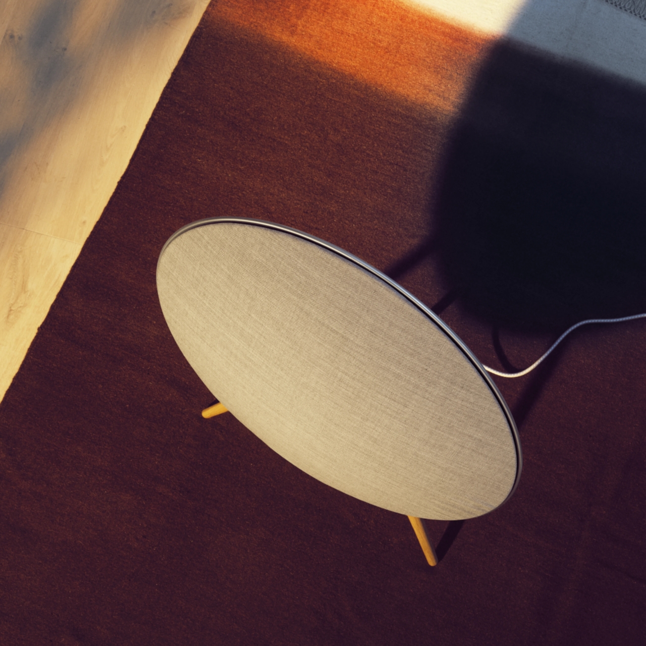 The showstopper, though, is definitely the Beosound A9, the largest piece in the collection. The A9 arrives in Century Blue and features Kvadrat’s Centennial Cadence fabric alongside a natural aluminum ring and brushed legs, with details that deliberately echo B&O products from the 1980s. If you’re not familiar with the A9, picture a massive circular speaker that’s immediately recognizable and completely unlike anything else on the market. Thanks to its replaceable, modular design and updatable software, it’s been designed to be fully future-proof. In a world of planned obsolescence, that commitment to longevity feels almost radical.