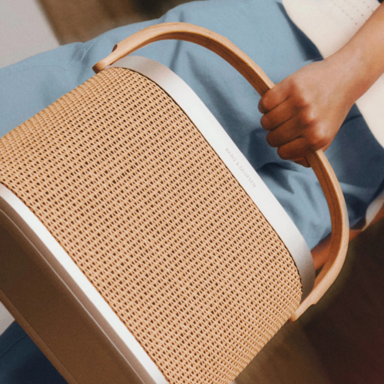 Then there’s the Beosound A5, the portable speaker that’s giving major vintage radio vibes. The Century Weave comes fitted with a paper raffia weave in beige and chestnut brown, designed to reimagine the chequered speaker grills of the 1950s and emulate the aesthetics of Bang & Olufsen’s earliest radios. I’m obsessed with how they took something so nostalgic and made it feel completely contemporary. The speaker features a Century Weave pattern across its grille, offset by brushed aluminum framing, while its strap and cable are finished in matching red and blue tones. It’s portable audio that looks more like an art piece you’d proudly display.