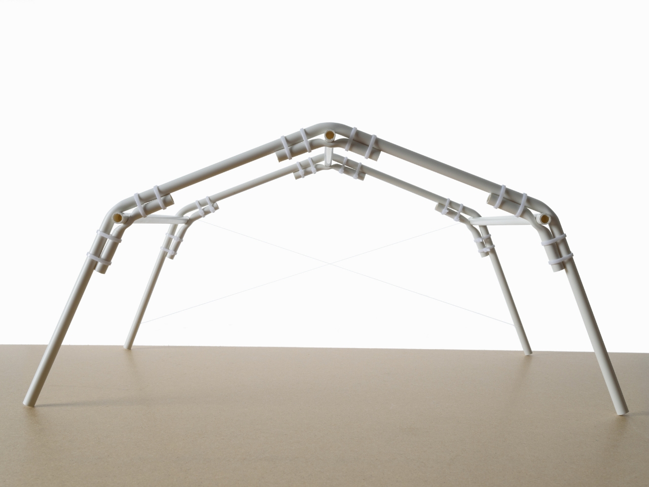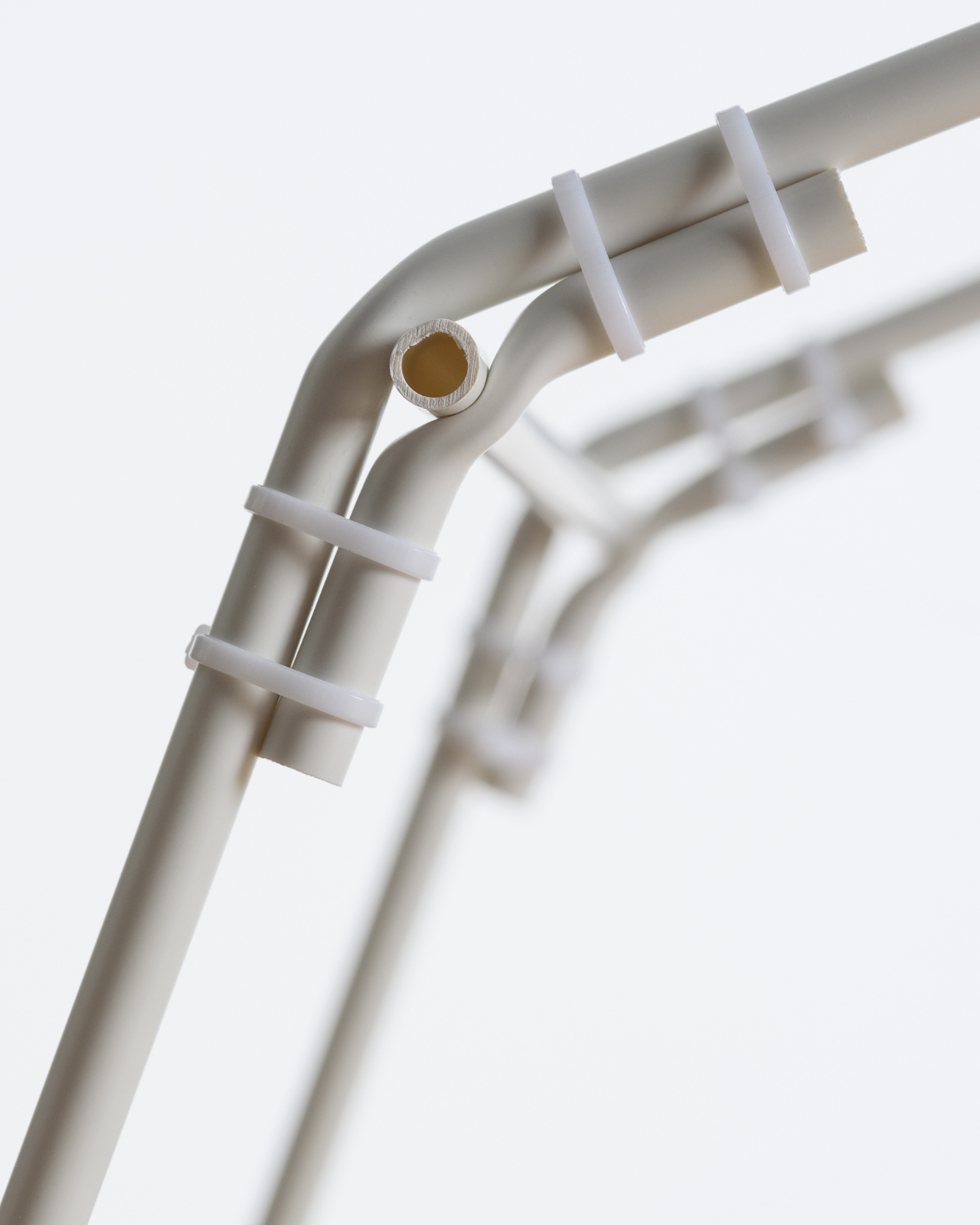 Here’s the thing about PVC pipe that most of us forget. It can be cut with simple tools, and once softened with heat, it can be reshaped easily. Marx took this basic property and turned it into an entire assembly system for emergency housing. Instead of hunting down T-joints, elbows, and corner pieces, you just heat up the pipe itself and bend it into whatever shape you need. Cable ties, which Marx calls flex clamps, are all that’s required to hold everything together. That’s it. Curved pipes and zip ties.