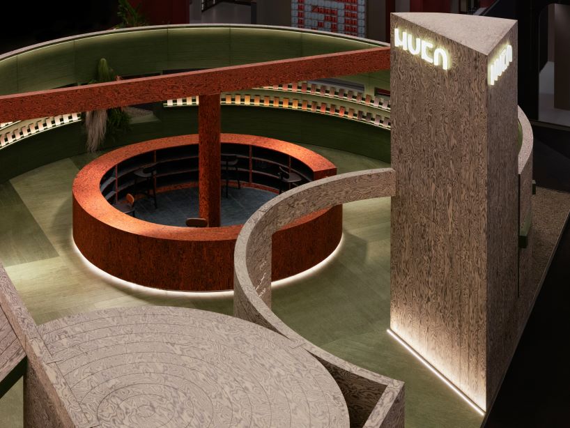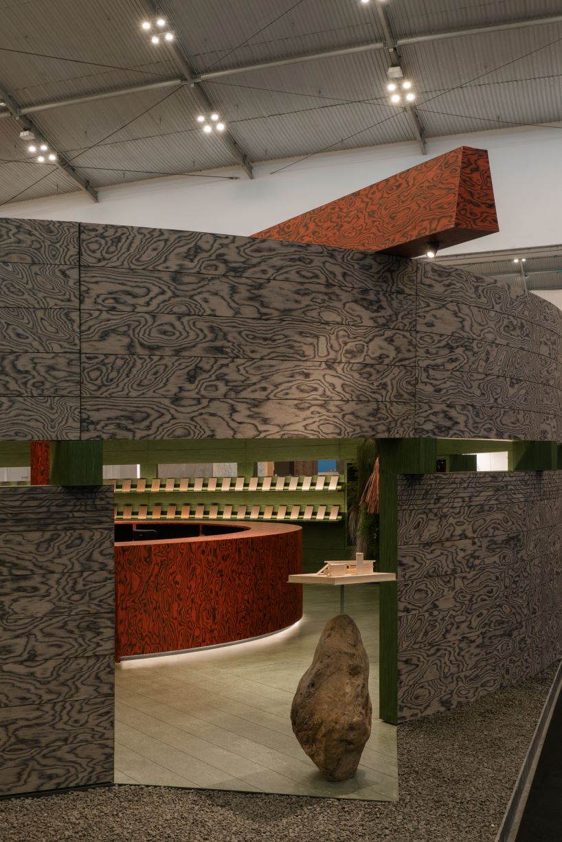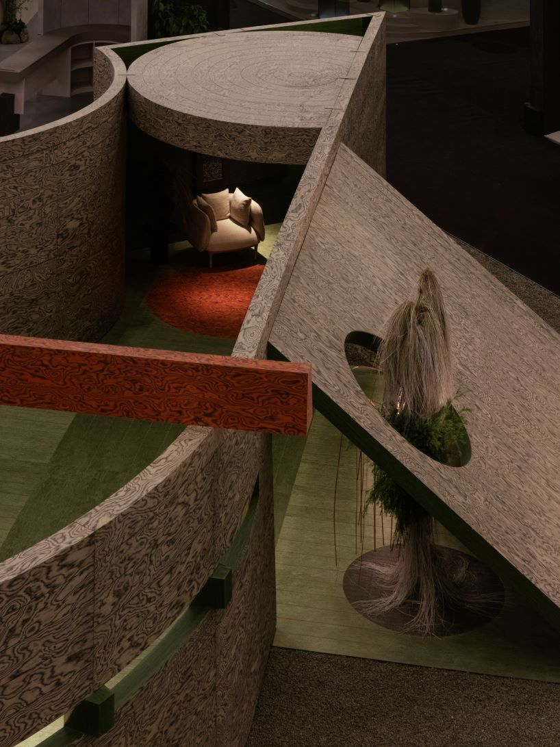 While exhibition halls often favor maximum density, A Nest in the Tree introduces restraint as a design strategy. By stepping back from the aisle and allowing the space to breathe, the booth establishes a clear threshold, inviting visitors to experience it as a unified spatial composition before entering. The layout follows a simple program, a single counter for welcoming guests, and a gallery for displaying MUKA’s wooden veneer products. The design draws conceptual and material inspiration from the process of veneer making, where thin layers are peeled from solid timber. Similarly, the booth is formed through an approach of carving and hollowing, subtracting and opening volumes within a solid mass. This operation produces a sequence of interconnected spaces for gathering, viewing, and rest.