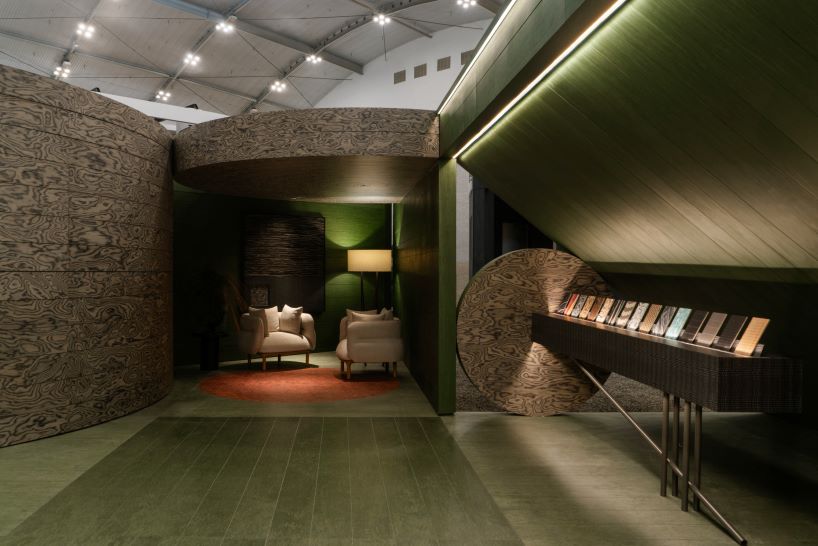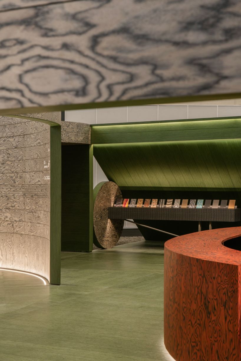 From the exterior, the booth appears as a grounded timber structure, but its interior reveals a network of voids and framed openings that encourage movement and visual exploration. Narrow slits along the facade allow glimpses of the interior, establishing a subtle boundary between privacy and display. For studio ISSO Architects, color and materiality play a central role. Departing from the natural tones typically associated with wood, the design showcases MUKA’s distinctive veneer colors through a layered chromatic experience. A muted grey facade opens to a vivid red central counter and a surrounding green wall. This gradient highlights the range of veneer textures and finishes while guiding visitors through distinct zones of the installation.