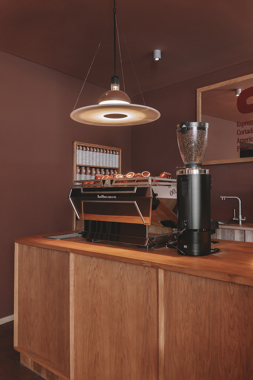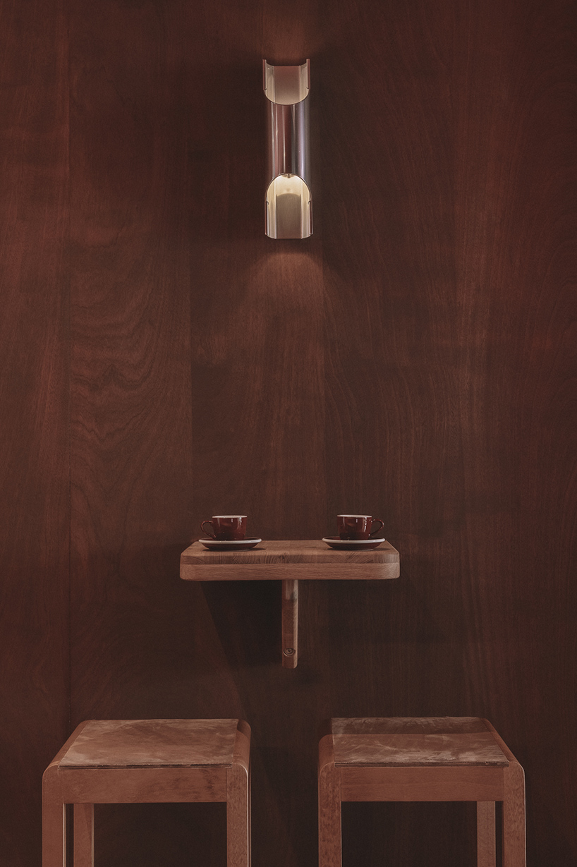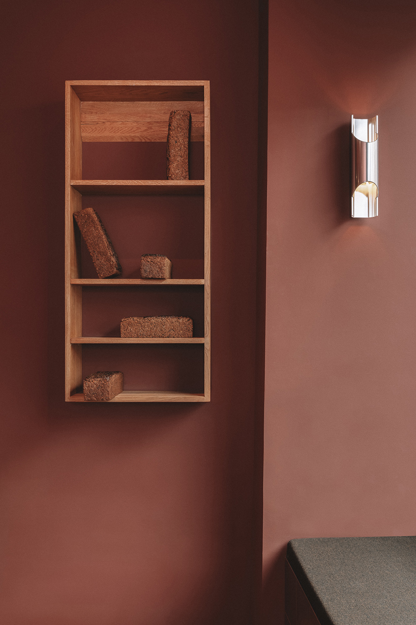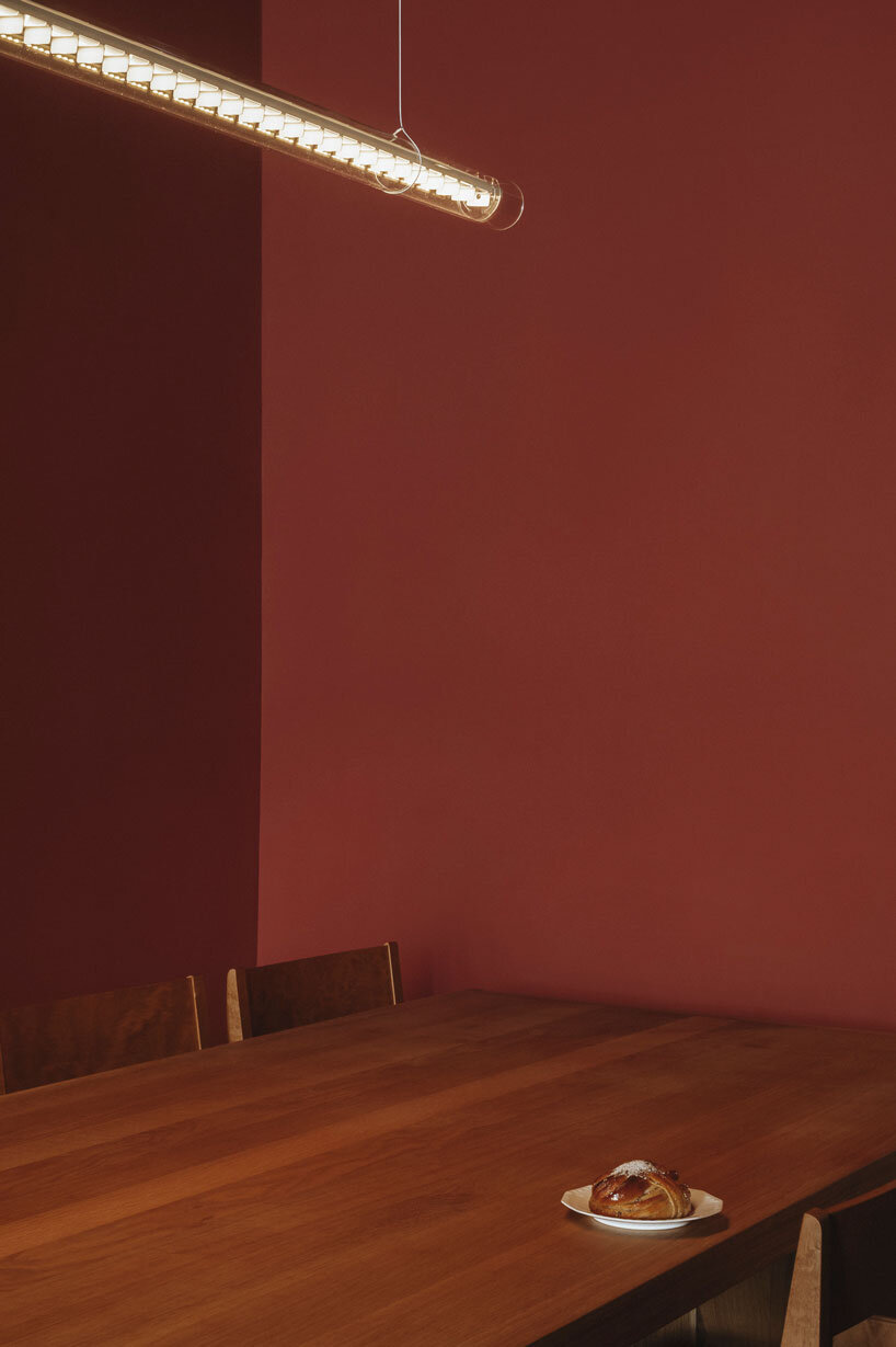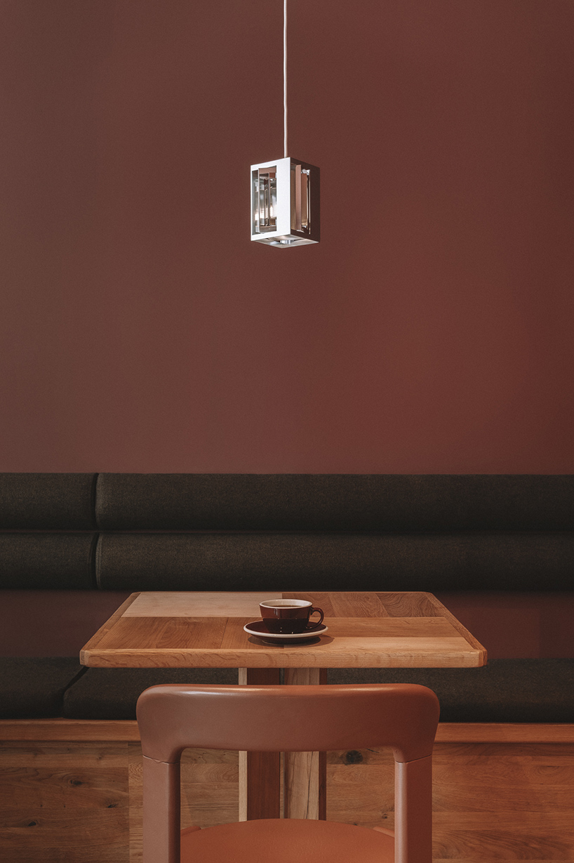 The interior concept by designer Thalea Schmalenberg accommodates this daily transformation. In daylight, the bakery emphasizes openness and the sensory presence of fresh pastries and bread. As night falls, lighting and materials create a warmer, more intimate atmosphere suited to dining. The design employs warm monochrome tones, handcrafted woodwork, and lighting elements from Danish and German manufacturers, establishing a cohesive environment that balances functionality and comfort.