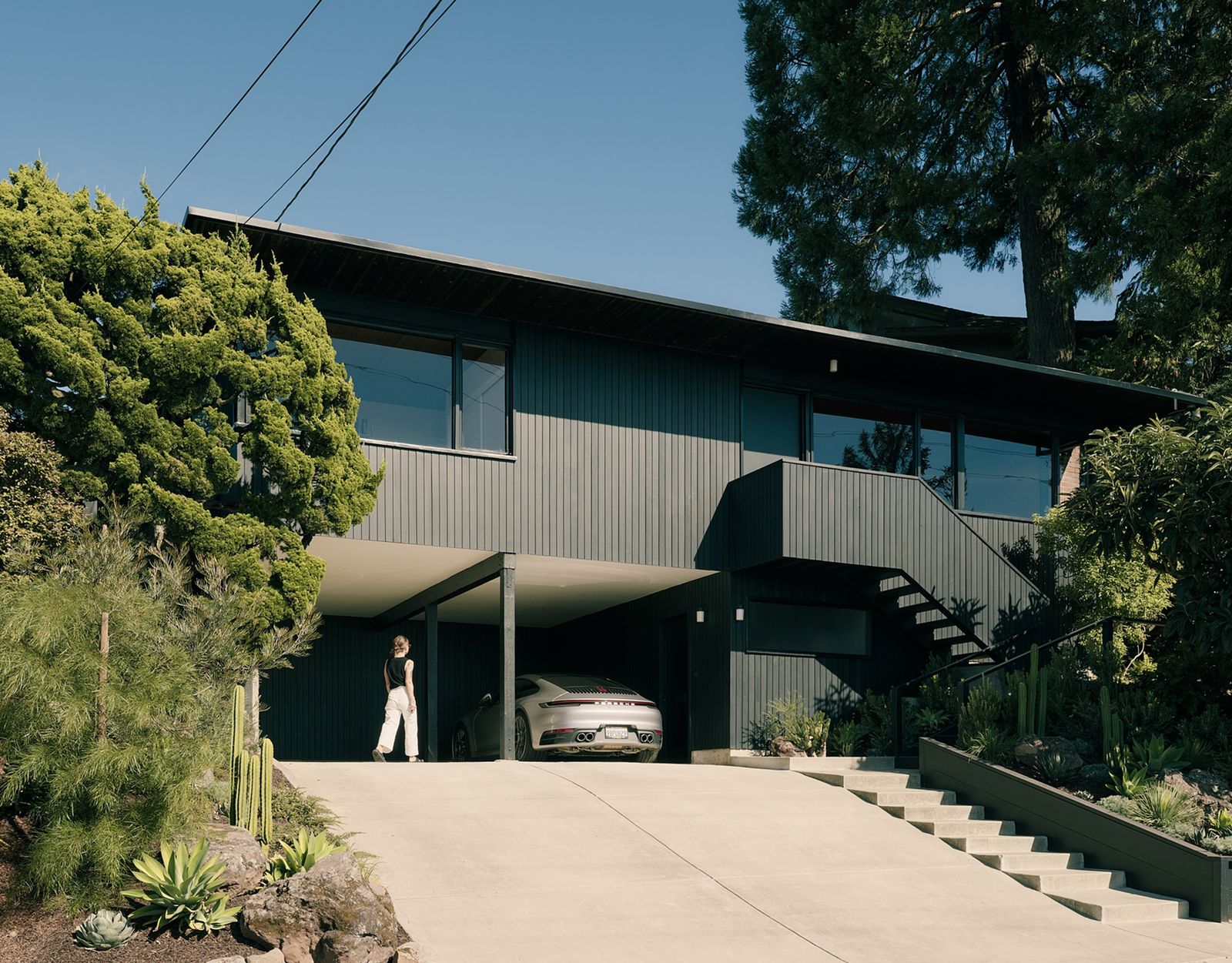 From the Architect: “Mork-Ulnes Architects has just completed a restoration of a Roger Lee–designed home in the Berkeley Hills, honoring its midcentury roots while updating the space for modern living. With views of the San Francisco Bay, the redesign retains signature elements such as a solid laminated two-by-six-inch ceiling with exposed beams, celebrating the warm, natural materiality of the mahogany wood interior. A precise intervention removed sections of original wall enclosures, enhancing the home’s strong planar language while preserving its original spatial concepts. This transformation opened up the previously enclosed galley kitchen to the main living area, fostering a greater sense of connection and light. New cabinetry and veneer walls form a wood-clad core that discreetly conceals the home’s functional elements. Two bathrooms buried within the wooden core surprise with vibrant red small mosaic tiles, while the kitchen, lounge, and primary bedroom are visually connected to the lush back garden, enhancing indoor/outdoor flow.”