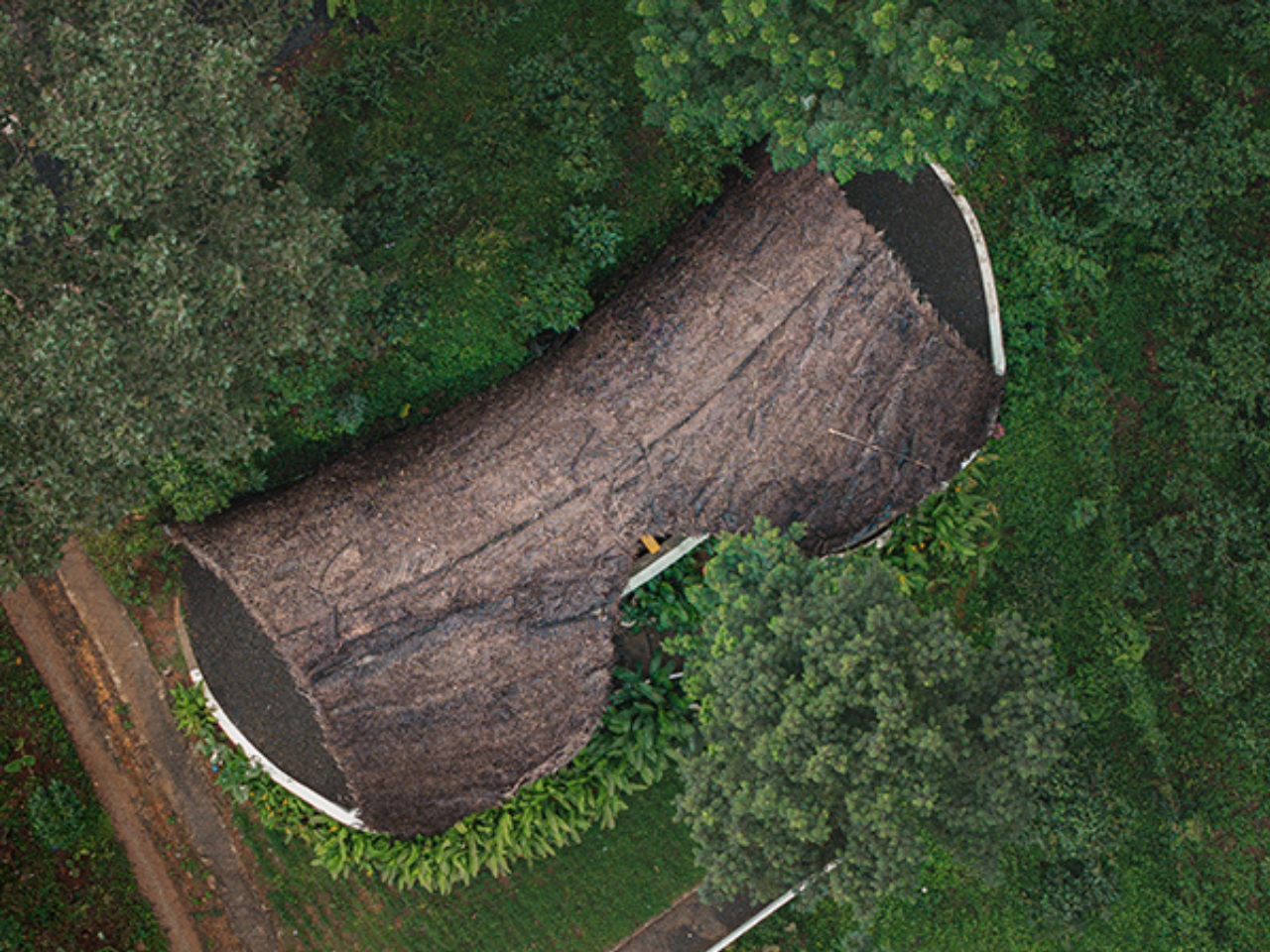 What makes this building truly special is its organic approach to materials. The ferrocement shell is wrapped in breathable mud plaster made from local soil and lime, creating natural insulation that keeps the interior comfortable year-round without energy-hungry air conditioning systems. Above this earthen embrace sits a crown of locally sourced thatch, softening the structure’s profile and helping it blend into the tropical canopy.