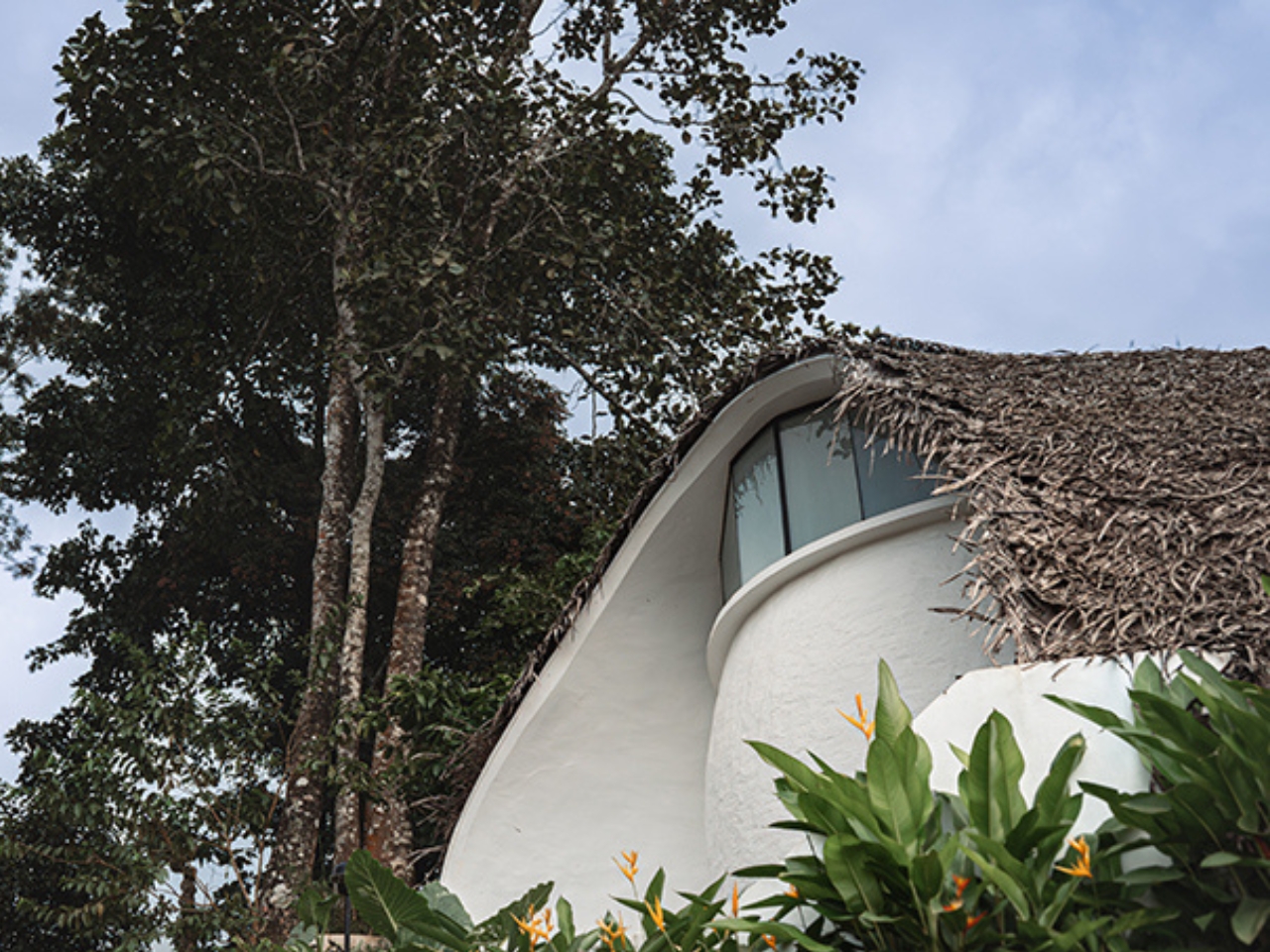 Inside, the spatial experience feels almost meditative. The curved walls create flowing interior spaces that encourage contemplation and connection with the surrounding landscape. Large windows frame views of the plantation, while the organic geometry eliminates harsh corners and straight lines, creating a cocoon-like atmosphere that promotes relaxation.