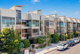 Architect Milton Stricker designed his 1967 residence with wood paneling, extensive built-ins, and a top-floor primary suite with a balcony.