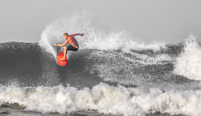 I found a rip and quickly made it out to the lineup, which was spread up and down the beach. I paddled into my first wave and knew it was going to be a fantastic day. The face held open with the offshore perfection (not too much wind where it’s tough to get in) and I pumped down the line, building speed before cutting back. The next section stood up for a lovely little top turn and it was on!