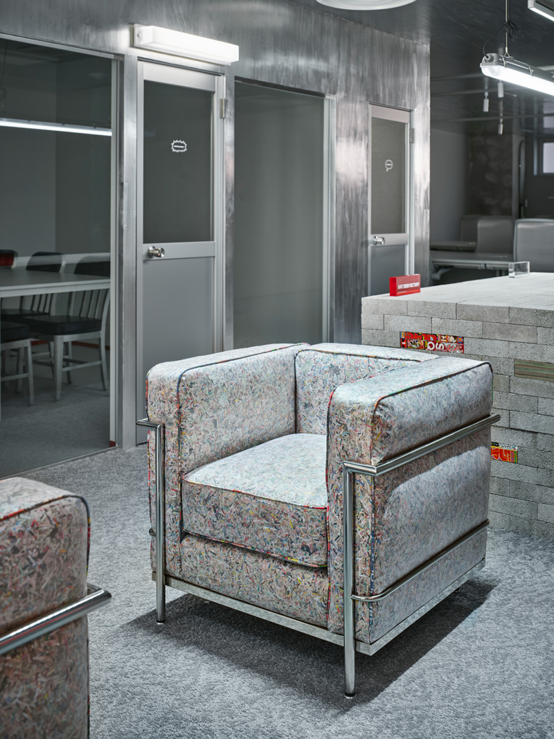 a Le Corbusier–inspired sofa is upholstered with recycled weekly magazines