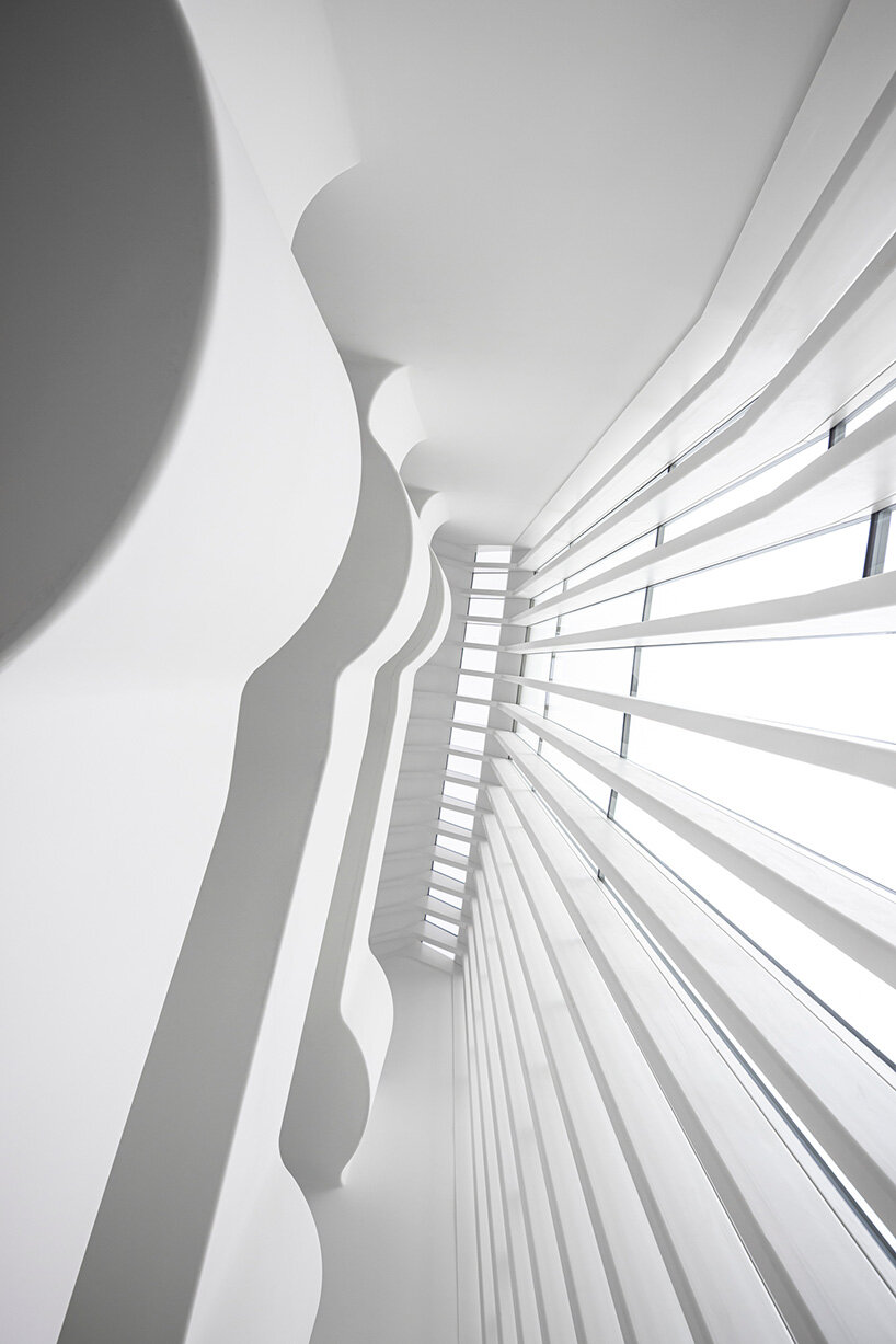 Calatrava describes Haus zum Falken as ‘an artistic event in the city.’ Its glass facade undulates across five levels, with vertical profiles and reflections shifting light and movement. Its articulated cornice and folded geometry lend the building a presence that changes with the time of day.