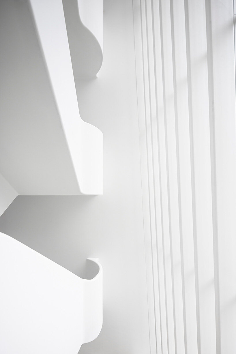 a four-story atrium and sculptural staircase form the spatial heart of the building
