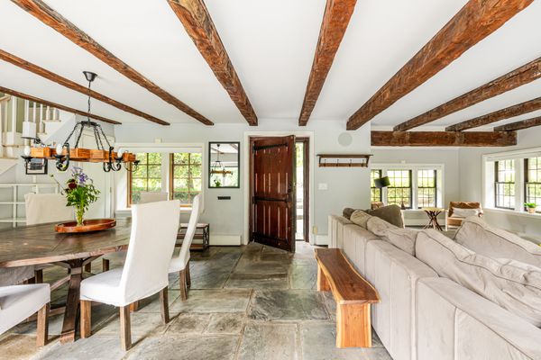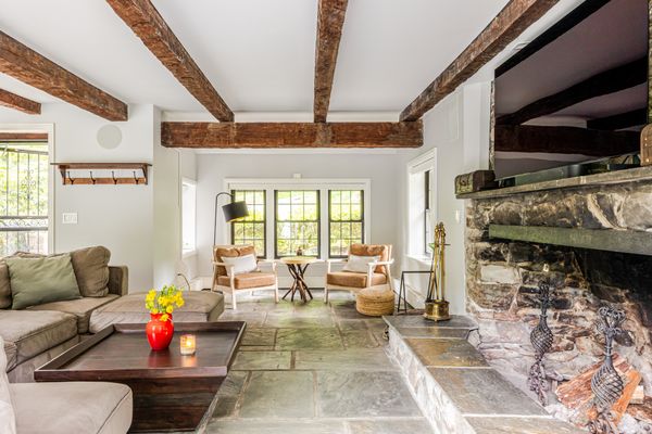 From the Agent: “Rooted in legacy, Embury Stone House is a 1930 historic retreat set on 12 private acres. With five bedrooms, three and a half baths, 4,164 square feet of turnkey living space, and a pool, the property pairs comfort with pedigree. Designed by renowned architect Aymar Embury II, the stone landmark was built as part of former Secretary of the Treasury Henry Morgenthau Jr.’s Fishkill Farms estate, and became a favored hunting retreat for President Franklin Delano Roosevelt. The home remains a masterwork of craft, with gables, soaring chimneys, and arched doorways that capture its storied past. Inside, original timber beams, mantels, and a grand stone fireplace anchor warm gathering spaces, while broad, Tudor-style windows frame mountain and woodland views, and flood the home with light. Outdoors, the property showcases extensive stonework amidst a landscape of rolling meadows, towering trees, and a meandering creek. A gated entrance, fencing, and thoughtful lighting enhance both privacy and peace of mind. With its rich history, timeless architecture, and turnkey comforts, Embury Stone House is a rare chance to own a piece of Hudson Valley History.“