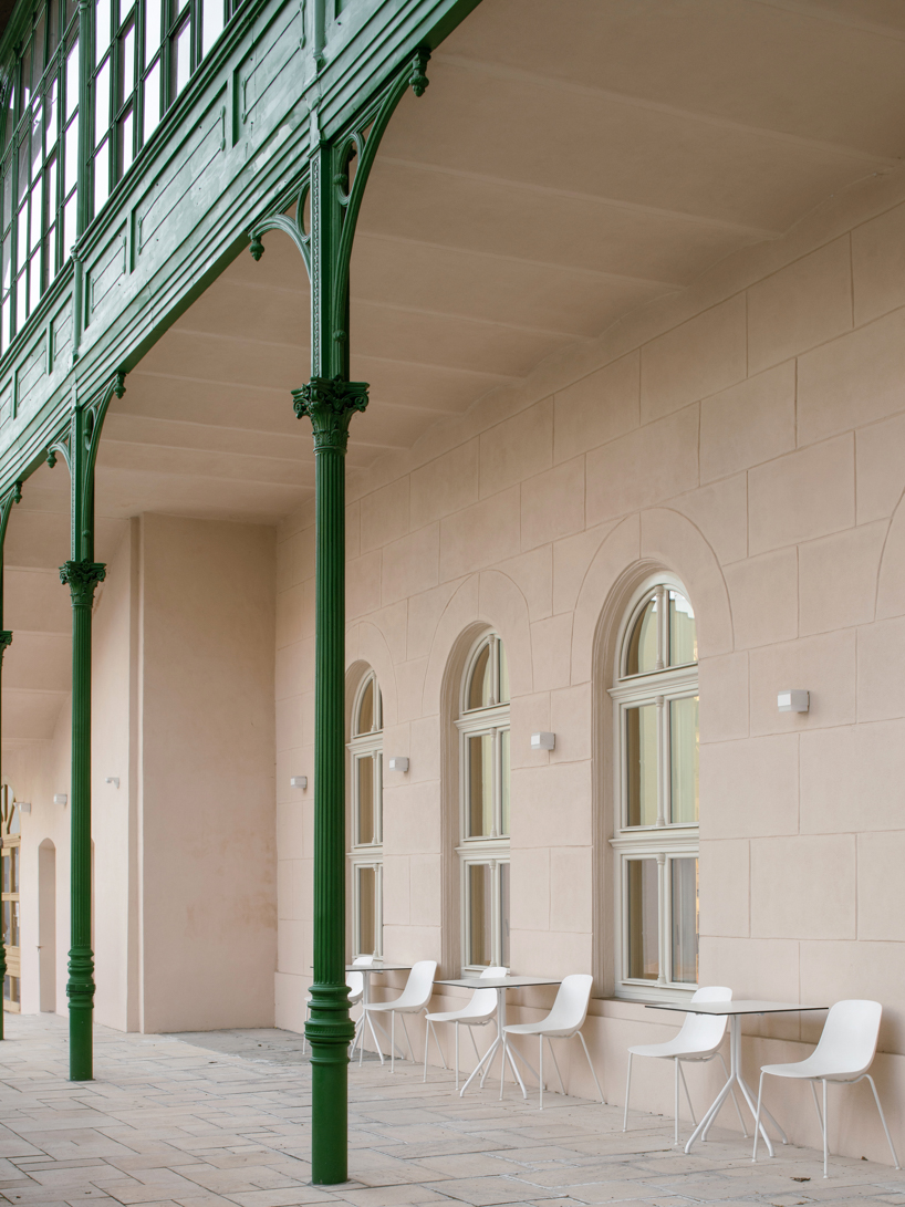 restored masonry walls with preserved historic paintings meet new cast-iron and steel components