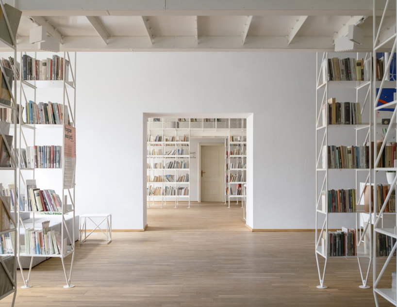 The post suspended steel shelving forms permeable curtain within revitalized historic slovak library appeared first on designboom | architecture & design magazine.