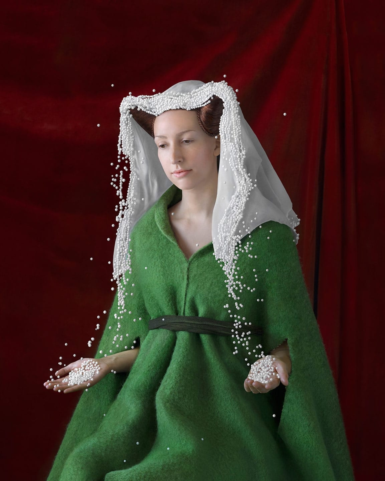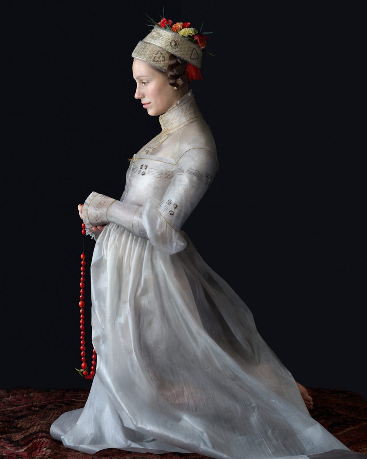 Her process is highly labor-intensive, involving hours of experimentation and meticulous handwork. Each piece is custom-built to fit the model, with careful attention paid to texture, composition, and silhouette. The finished costumes are then immortalized in photographs that echo the soft, painterly quality of Renaissance portraiture. These images have gained international attention, earning Jongmans exhibitions in galleries and museums across Europe and beyond.