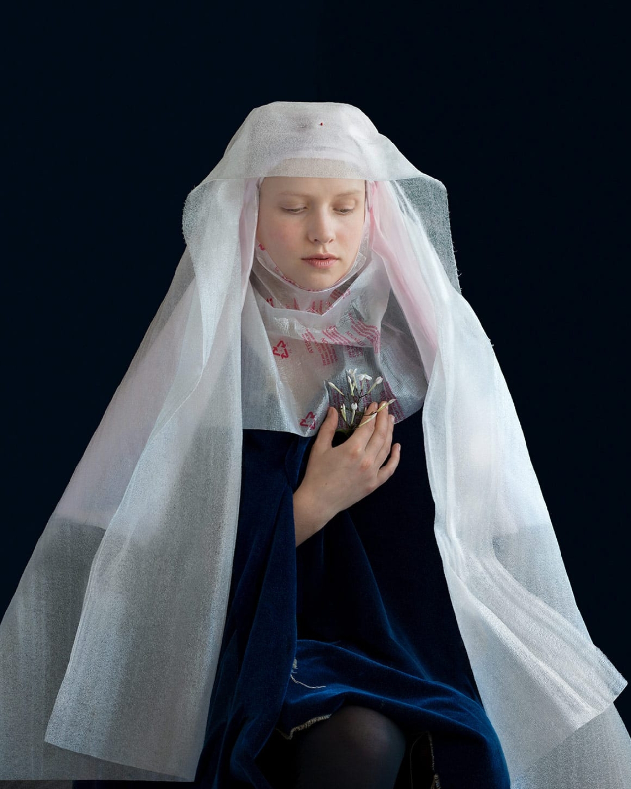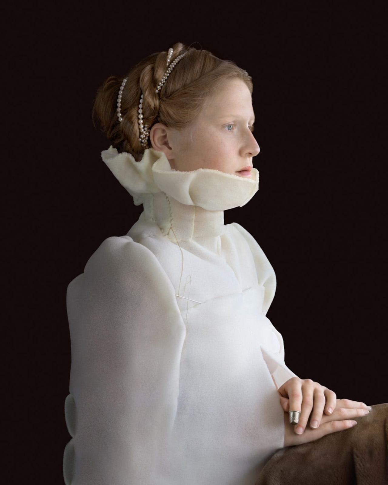 Jongmans’ inspiration comes from her fascination with the Old Masters, particularly the painters of the sixteenth and seventeenth centuries. Her work pays homage to the meticulous detail and subtle lighting found in the portraits of artists like Rembrandt and Holbein. By photographing her costumed models in poses reminiscent of these iconic paintings, Jongmans creates a visual dialogue between eras. The result is a series of images that feel both timeless and contemporary, inviting viewers to reconsider what constitutes luxury, value, and sustainability in fashion.