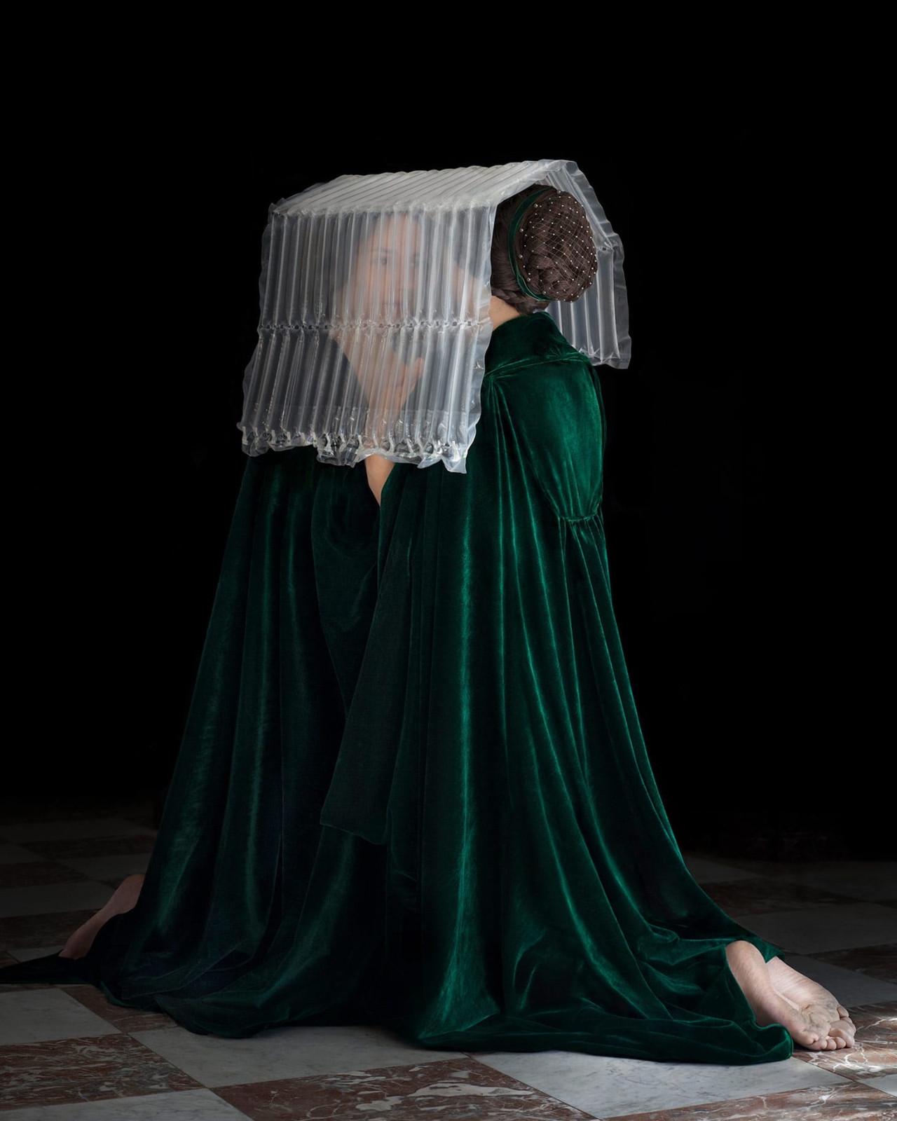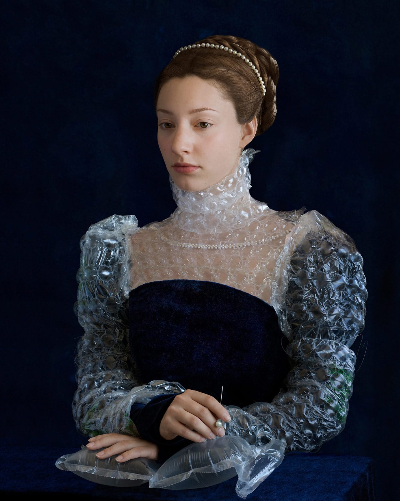 Suzanne Jongmans’ costumes are instantly striking. At first glance, her creations appear to be authentic Renaissance garments, with their dramatic collars, structured bodices, and sculptural silhouettes. However, a closer look reveals the surprising origins of the materials. What looks like delicate lace might actually be bubble wrap, while a seemingly stiff ruff could be made from molded foam or plastic. Jongmans carefully collects and repurposes these everyday objects, transforming them into wearable art that both honors and subverts classical traditions.