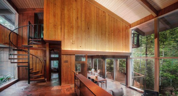 Architect Herbert Millkey designed the 1969 home with extensive wood paneling, stone walls, and balconies overlooking the surrounding forest.