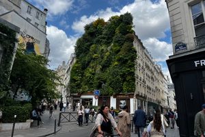 This 25-meter-high green mural features more than 7,000 plants from 237 species, arranged in diagonal waves that appear to climb the façade.