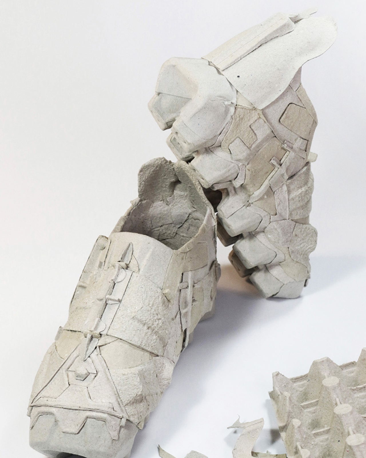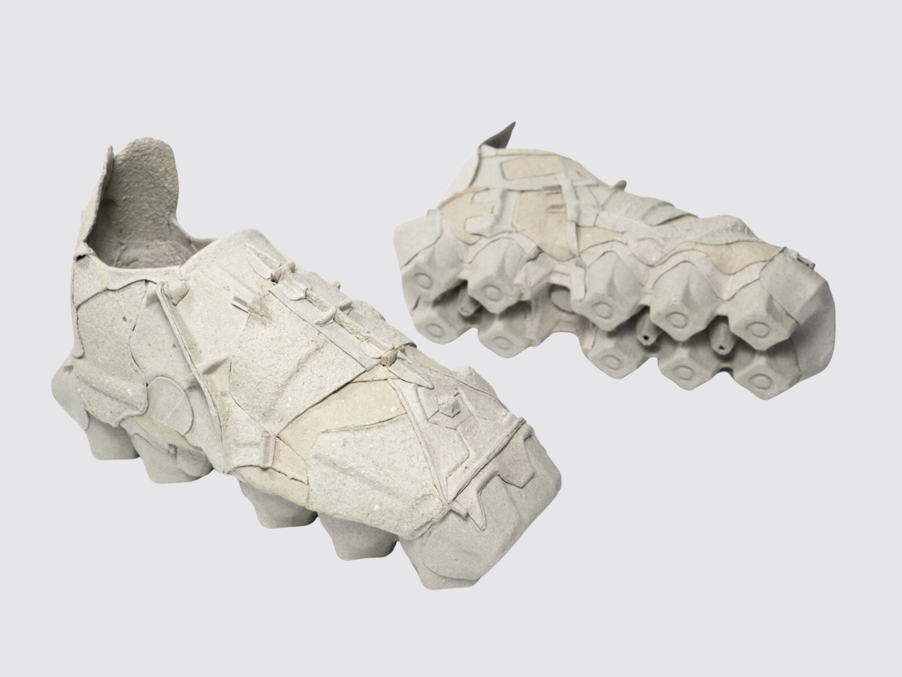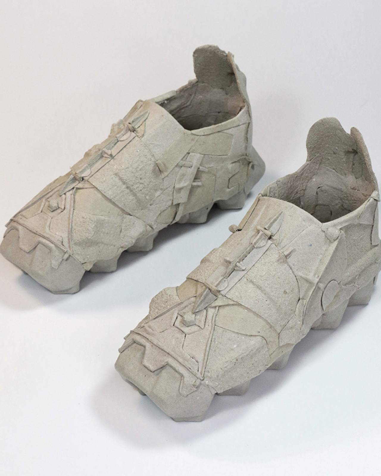 What makes these sneakers particularly fascinating (besides the obvious weirdness factor) is their construction. Using only two types of carton egg boxes, the project investigates the structural and aesthetic potential of limited resources. The result looks exactly like what you’d imagine if sneakers and egg cartons had a design baby. The soles resemble an egg tray flipped upside down, the uppers layered like cracked armor. It’s weird. It’s sculptural. It’s the kind of thing that makes you stop scrolling.