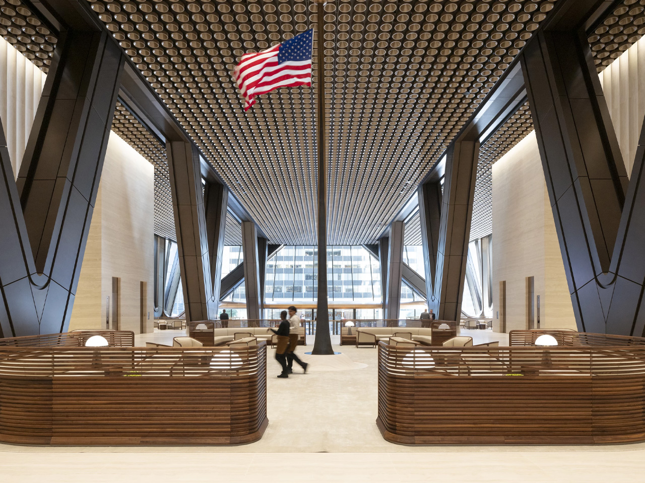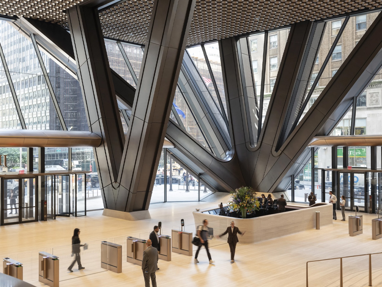 At first glance, 270 Park Avenue is instantly recognizable by its dramatic, stepped silhouette and bronze diagrid crown. The architects at Foster + Partners engineered the tower to be visually striking yet structurally daring: the main building mass is elevated nearly 80 feet above street level, supported by colossal fan-shaped columns that give the base a sense of lightness and openness. This not only creates a grand, welcoming entrance but also expands the public realm.