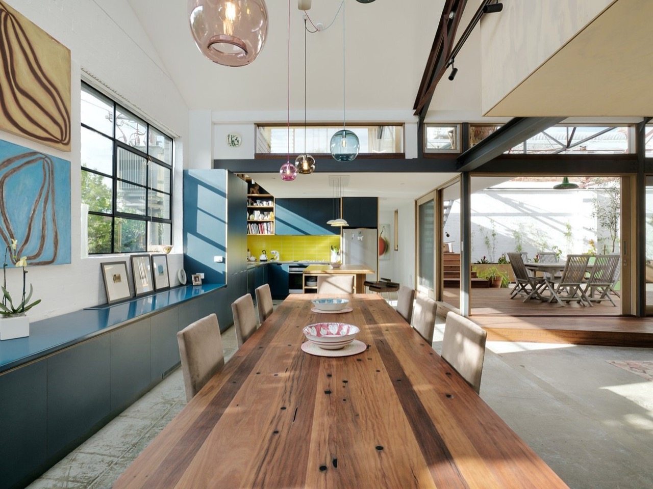 The interior palette is an exercise in restraint. Deep teal cabinetry with a yellow backsplash accent in the kitchen, natural plywood for the mezzanine boxes, and that polished concrete everywhere else. The lighting mix spans industrial green enamel pendants, colorful glass spheres over the dining table, and black track fixtures on the exposed structure. No fussy chandeliers or Pinterest-core fixtures trying too hard. The furniture reads eclectic without feeling curated to death, a rustic timber dining table with visible character, black sectional sofa, some mid-century modern pieces, kilim rugs. It looks like people actually live here, which is apparently controversial in architectural photography.