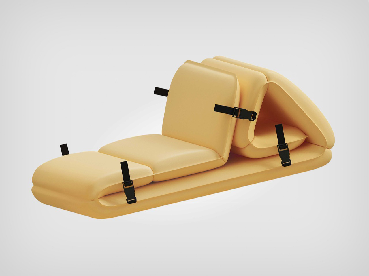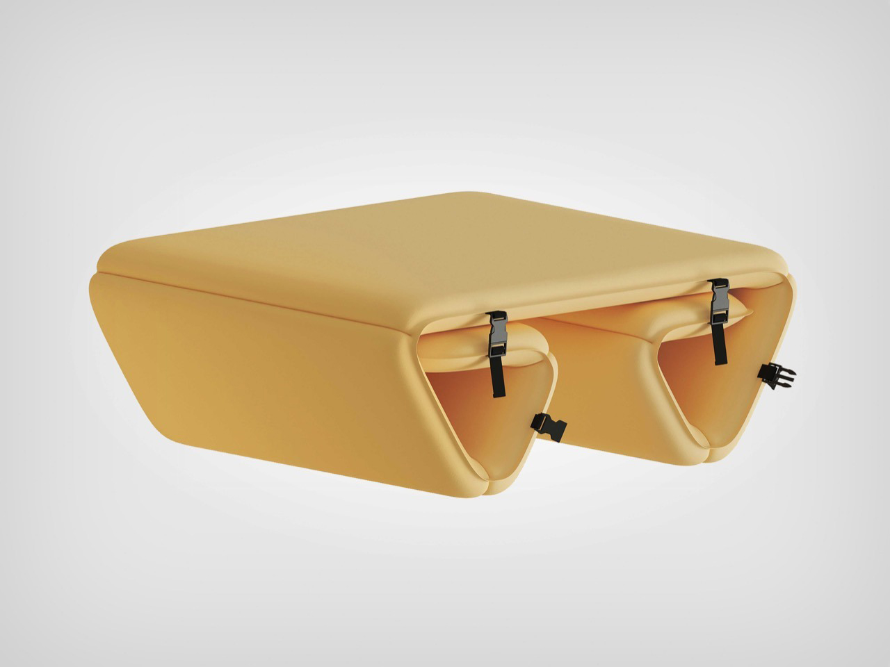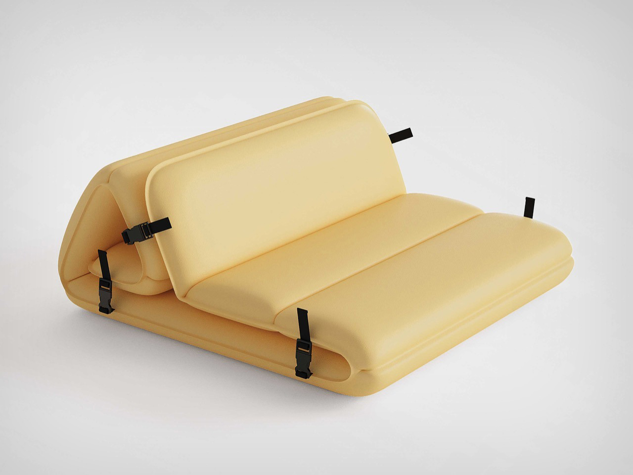 The system consists of inflatable panels that can be combined to form a lounge chair, a sofa, or even a low table. The design is refreshingly minimalist, with a soft yellow hue that’s easy on the eyes and practical for outdoor use. The buckles and straps are exposed but intentional, giving the product an industrial yet approachable aesthetic. It’s the kind of design that feels like it belongs in a high-end outdoor catalog, not just because it looks good, but because it’s clearly been thought through. The automatic inflation nozzle is a particularly smart touch, eliminating the need for manual pumps or lung-busting effort.
