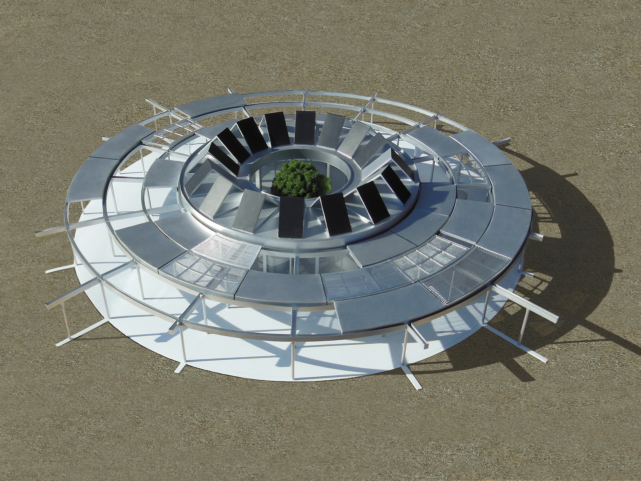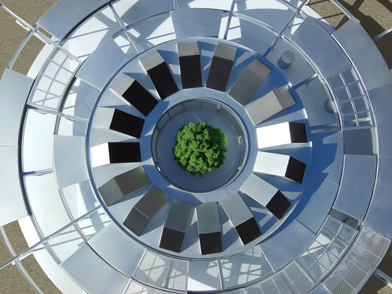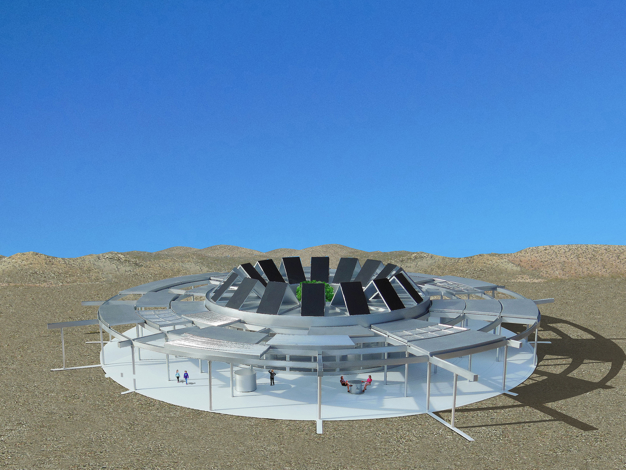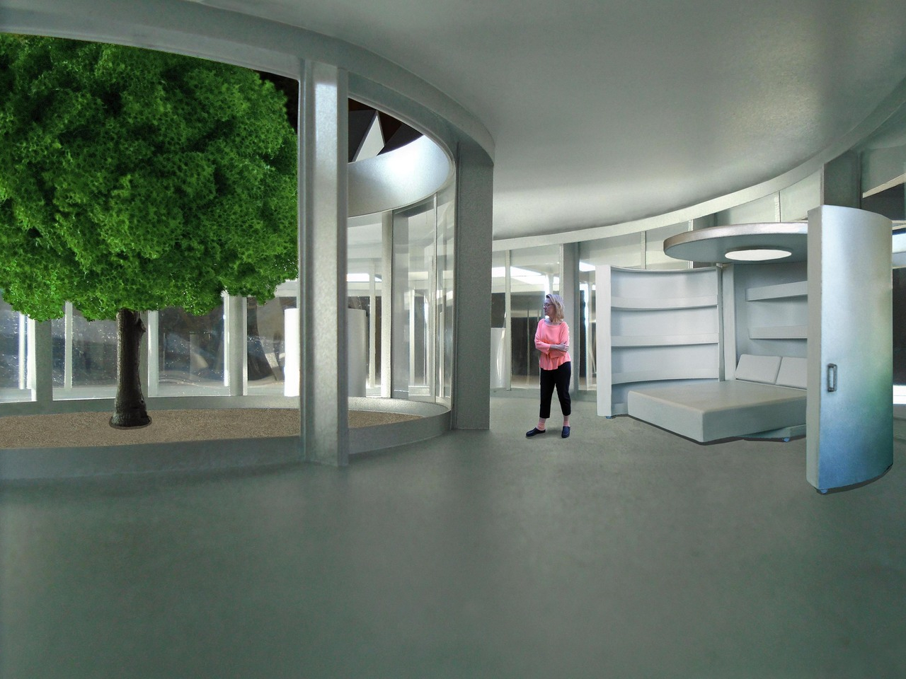 Solar panels mounted around the courtyard perimeter supply electricity and hot water for the entire home, while the interactive rings invite residents to shape their environment in real time based on immediate needs. The house’s metallic, geometric form creates a striking visual contrast against natural landscapes, emphasizing the dynamic relationship between human habitation and organic growth.