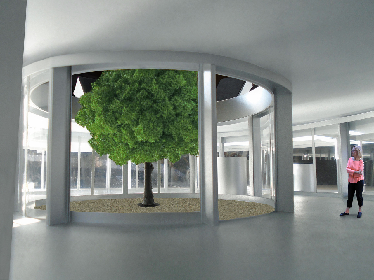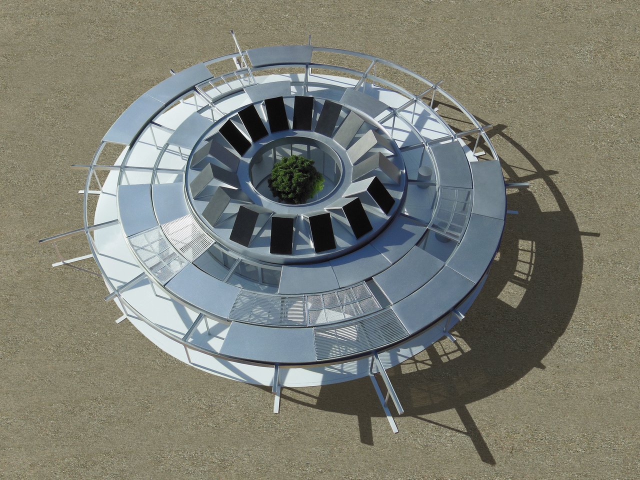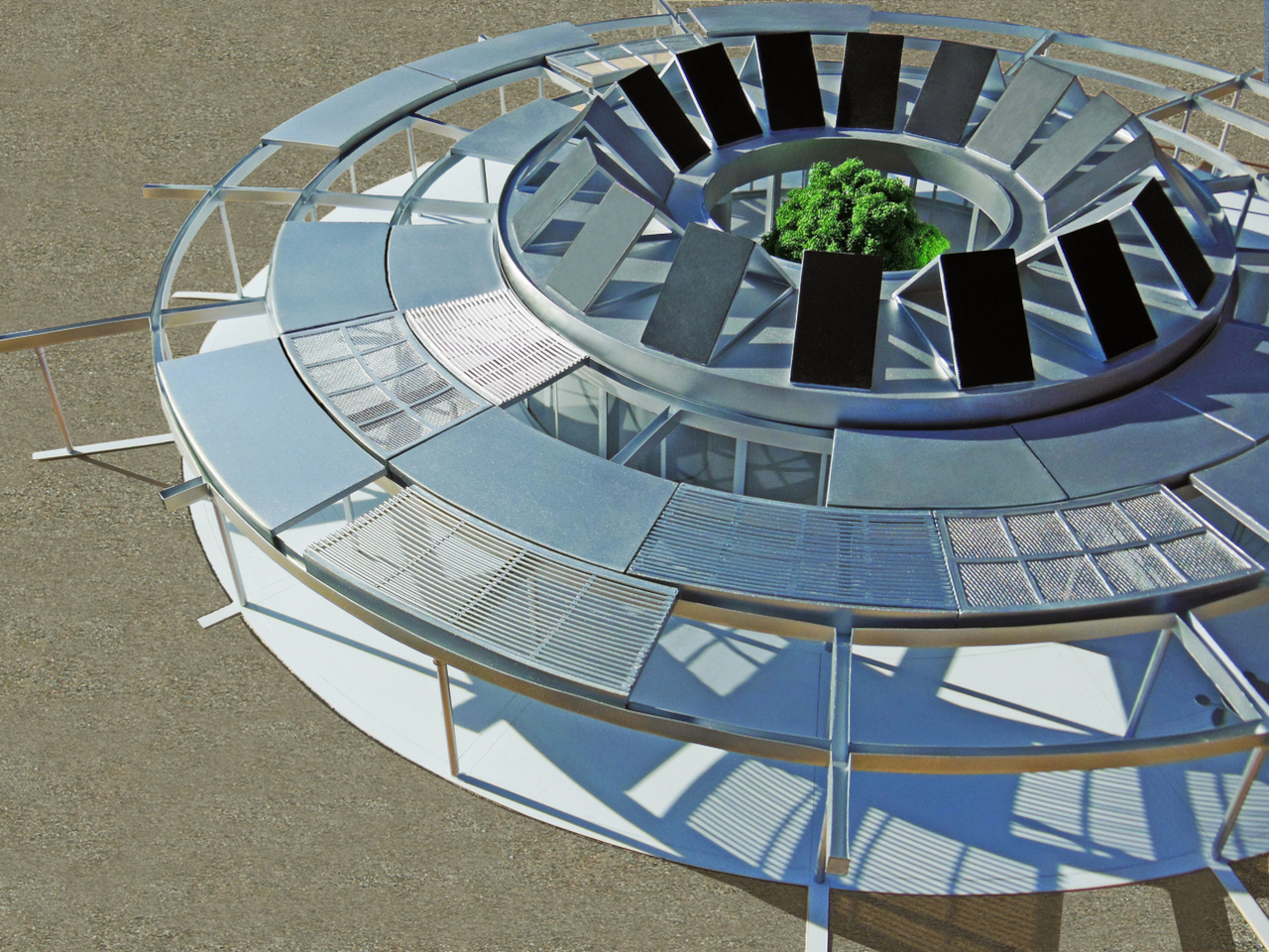 Solar panels mounted around the courtyard perimeter supply electricity and hot water for the entire home, while the interactive rings invite residents to shape their environment in real time based on immediate needs. The house’s metallic, geometric form creates a striking visual contrast against natural landscapes, emphasizing the dynamic relationship between human habitation and organic growth.