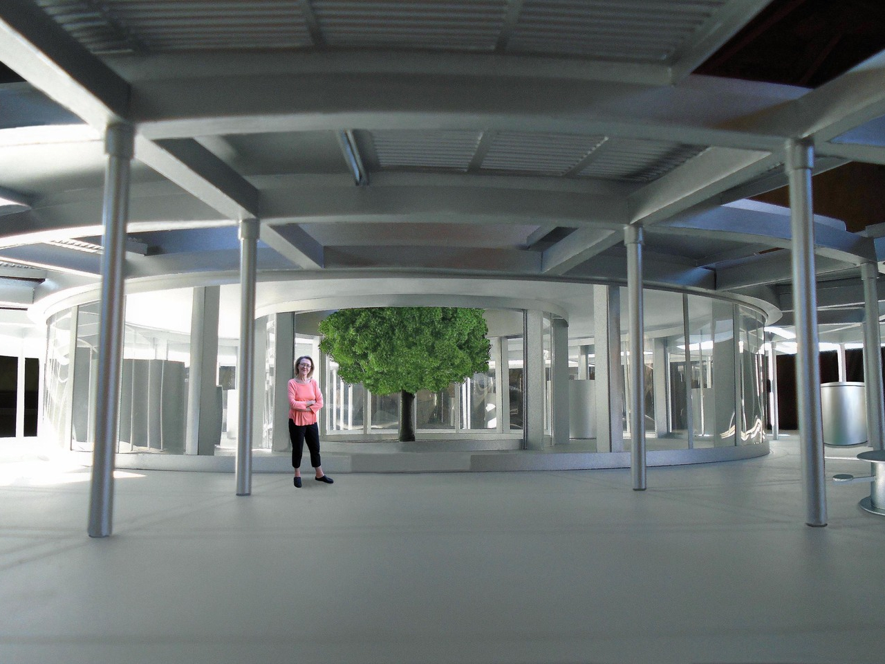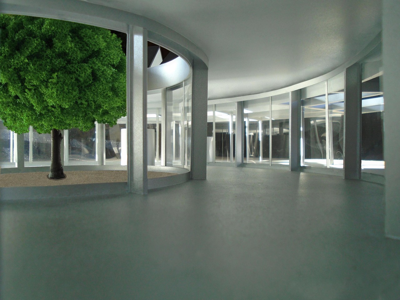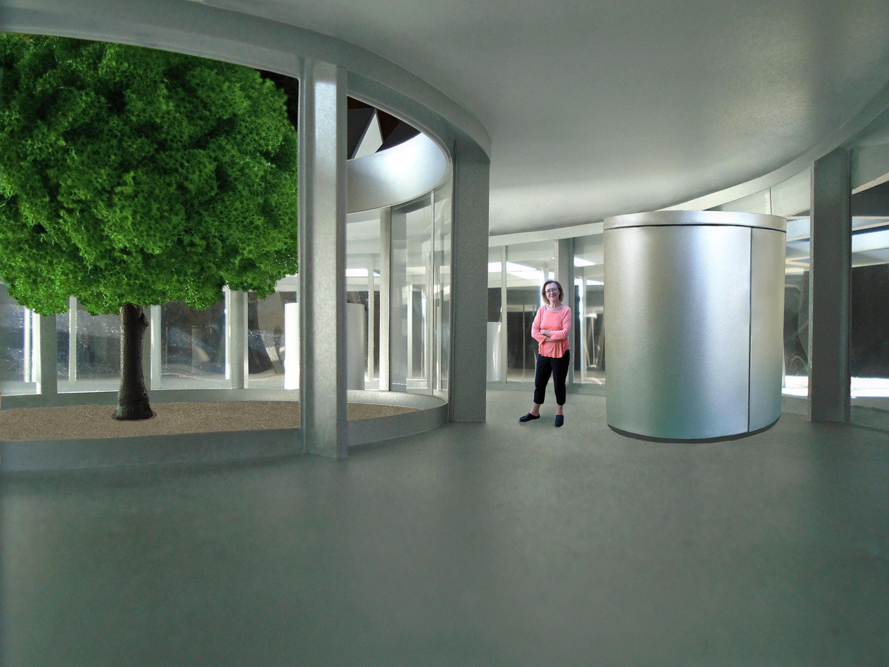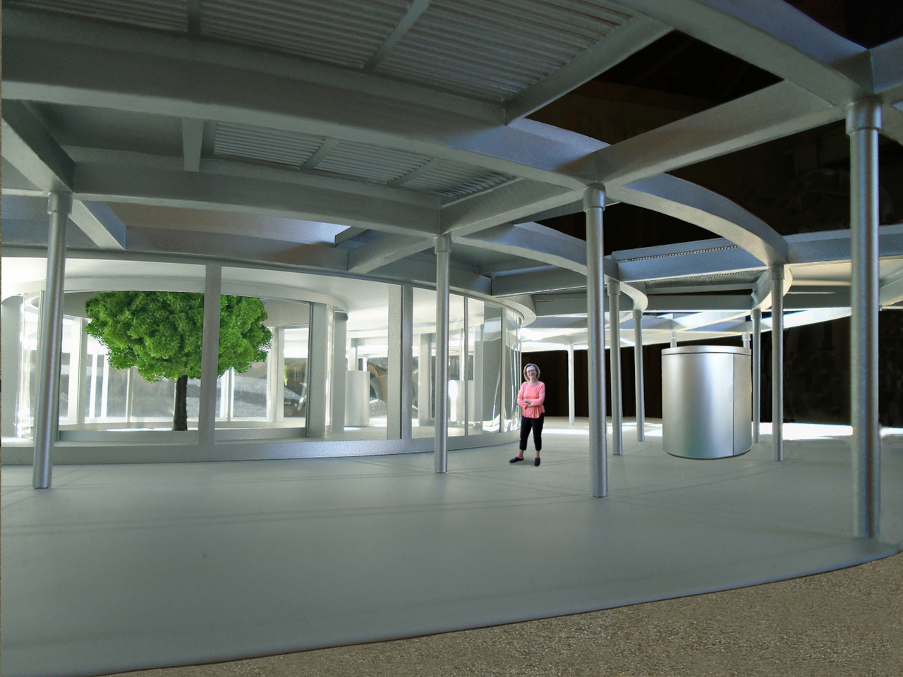 Solar panels mounted around the courtyard perimeter supply electricity and hot water for the entire home, while the interactive rings invite residents to shape their environment in real time based on immediate needs. The house’s metallic, geometric form creates a striking visual contrast against natural landscapes, emphasizing the dynamic relationship between human habitation and organic growth.