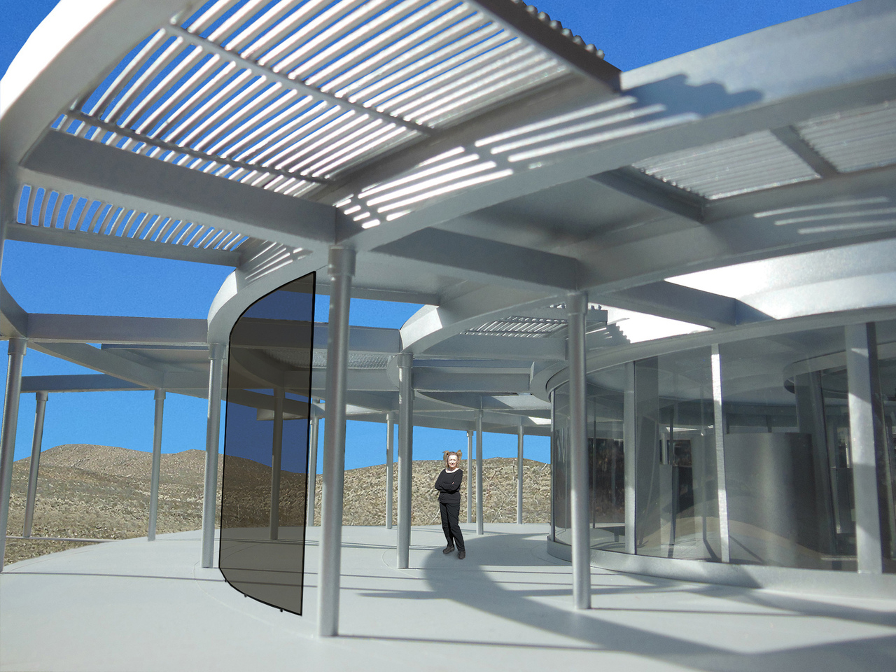 Three of the concentric rings support movable panels that can be repositioned manually or automatically around the house’s perimeter throughout the day or across seasons. Some panels are solid for shade and privacy, others are fitted with glass for capturing light, and still others feature louvers or screens for natural ventilation and airflow control.