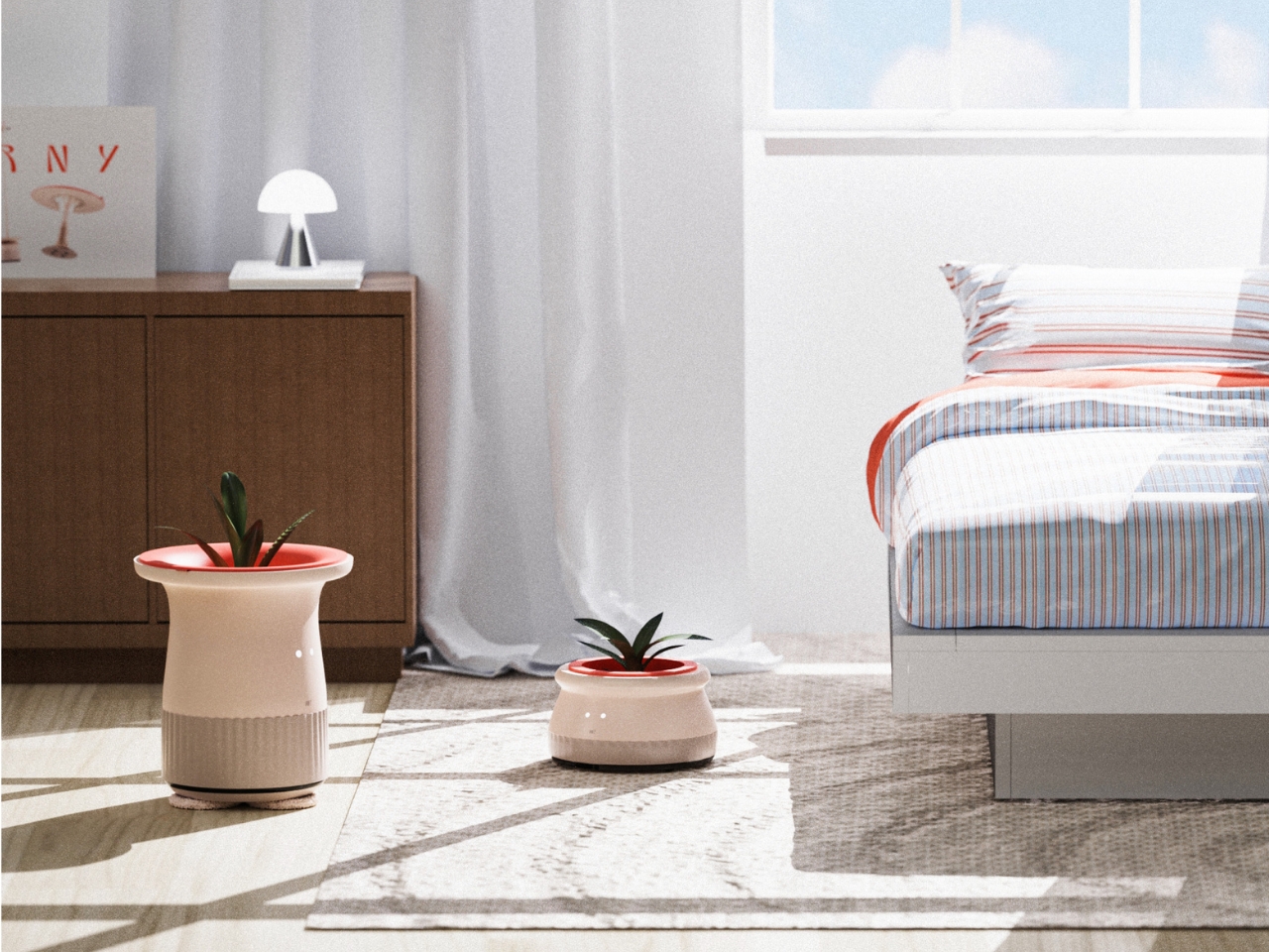 In the morning, when someone enters a common space, FURNY becomes “HI!” mode. It positions itself as a welcoming presence, often incorporating plants as a focal point. Plants are perfect ice breakers, right? Everyone can comment on how the succulent is doing or share watering tips. It’s the kind of small talk that feels natural and unforced, the kind that happens when you’re both just existing in the same space doing normal things.
