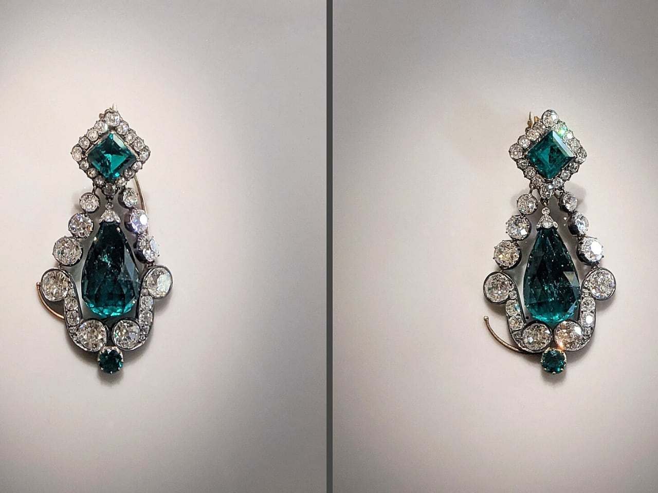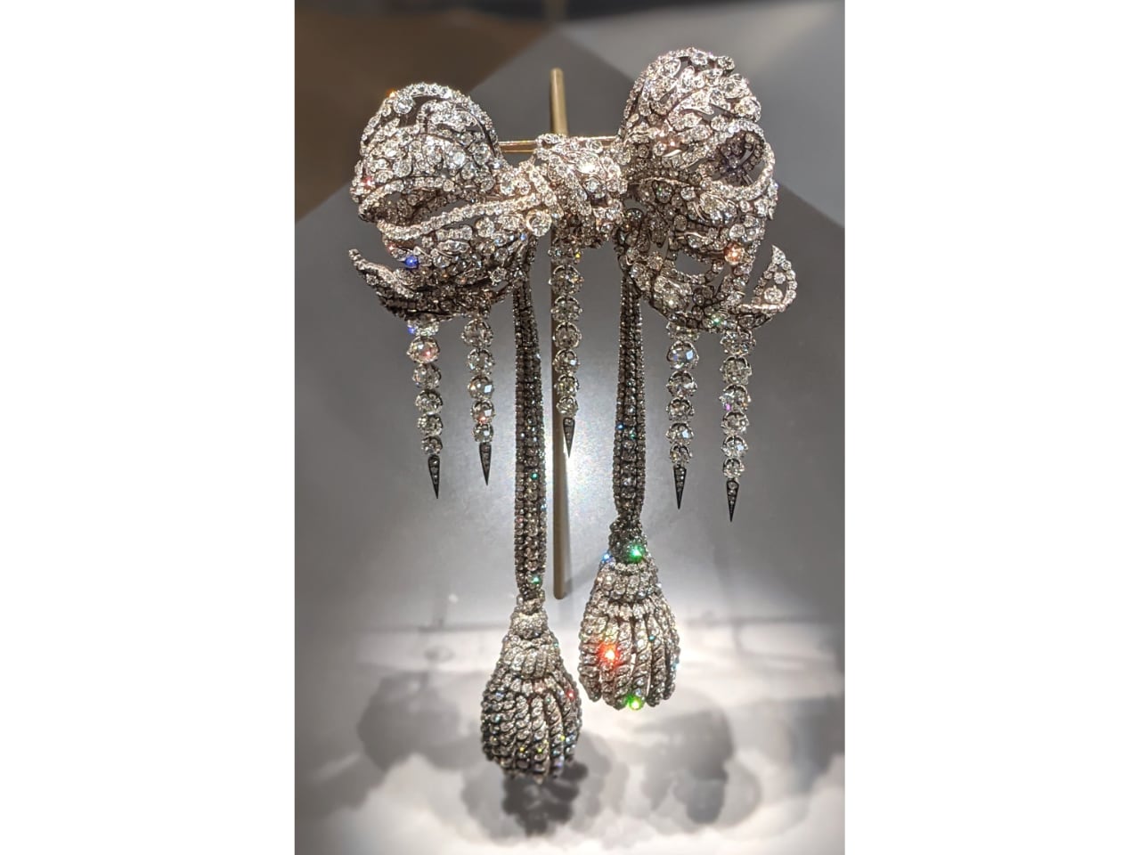 The two stolen brooches from Empress Eugénie’s collection represent Second Empire jewelry design at its most technically ambitious. The large corsage-bow brooch contains 2,438 brilliant-cut diamonds plus 196 rose-cut diamonds in a single piece, requiring engineering solutions for mixed cutting styles.