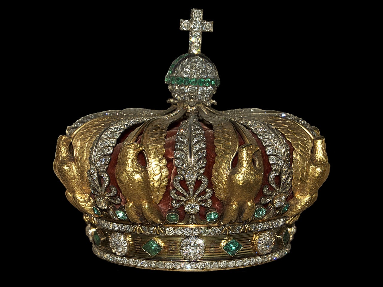 The design vocabulary was political calculation. Scrolls and palmettes referenced Greco-Roman antiquity, positioning Napoleon as heir to classical emperors rather than another European monarch. Palmettes are stylized palm leaves appearing on Greek temples and Roman friezes. Nitot carved them in gold and silver, surrounding them with emerald medallions to create visual language that communicated imperial legitimacy without words.