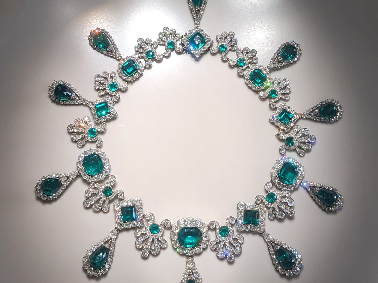 The necklace demonstrates sophisticated gem hierarchy engineering. Nitot arranged emeralds in specific patterns among the diamond field, using size progression to control how viewers’ eyes moved across the piece. The deep green emeralds absorbed certain wavelengths while surrounding diamonds reflected others, creating calculated color contrast that enhanced both stone types. This wasn’t aesthetic preference. It was optical engineering executed in precious materials.