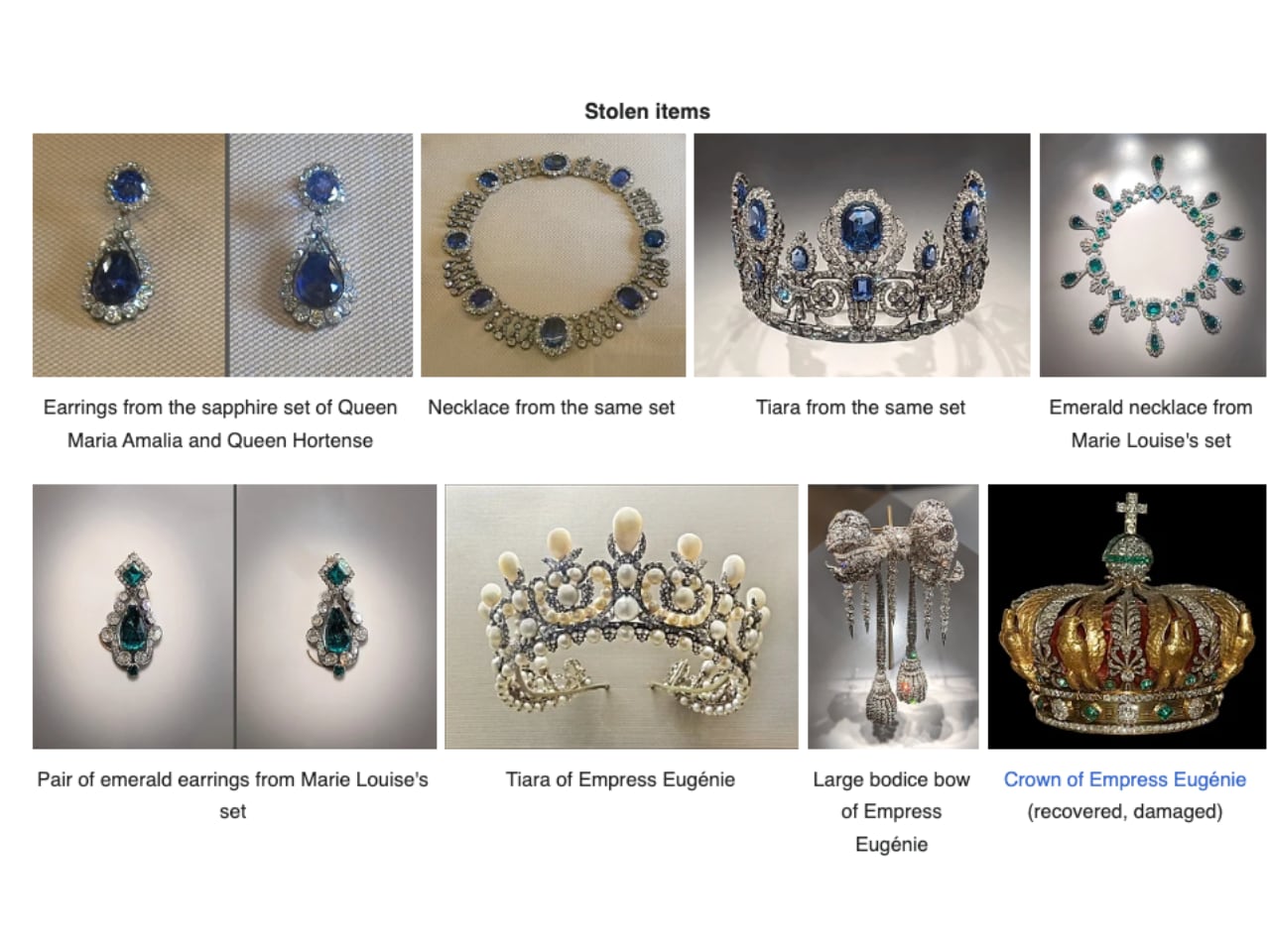 The stolen sapphire diadem, necklace, and earring (one was left behind) belonged to Queens Marie-Amélie and Hortense, representing Bourbon Restoration and July Monarchy jewelry design from the early 19th century. These pieces demonstrate different design priorities than Napoleon’s neoclassical approach.